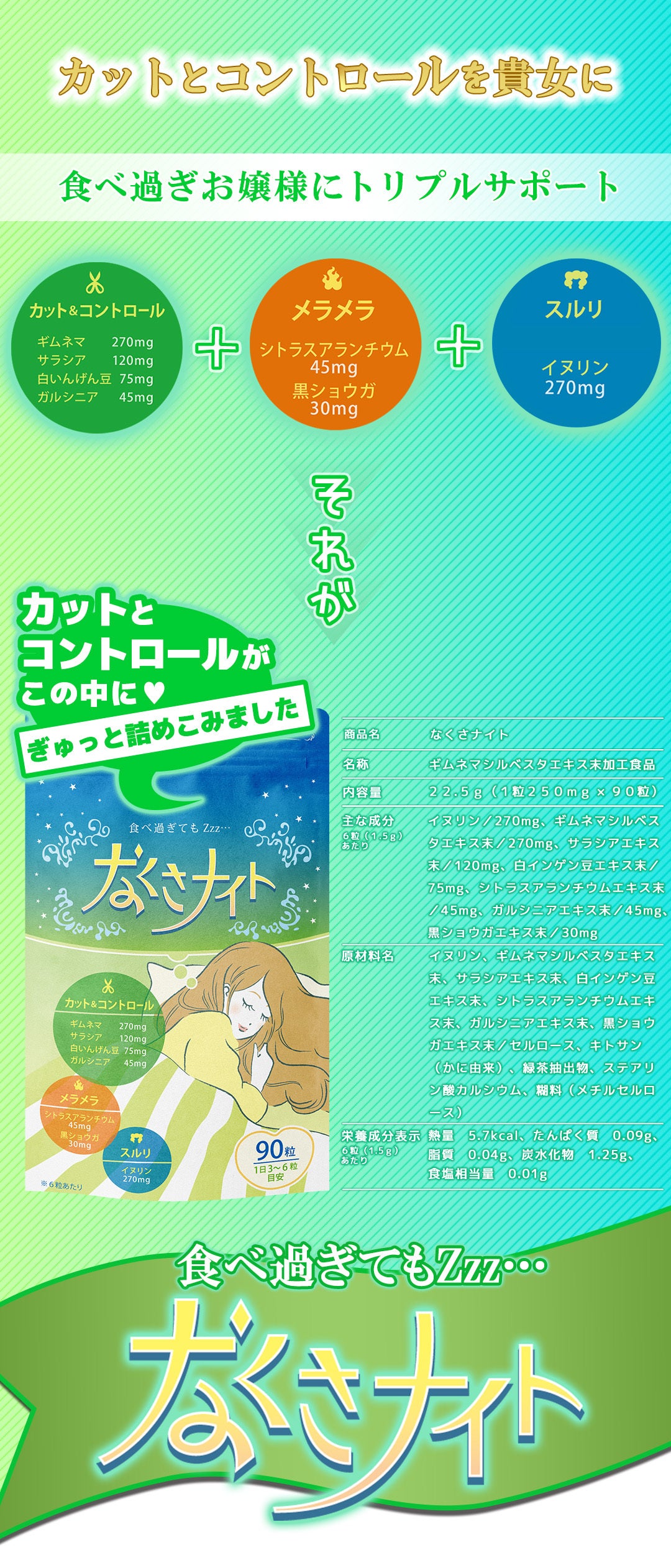 ・原材料:イヌリン、ギムネマシルベスタエキス末、サラシアエキス末、白インゲン豆エキス末、シトラスアランチウムエキス末、ガルシニアエキス末、黒ショウガエキス末/セルロース、キトサン(かに由来)、緑茶抽出物、ステアリン酸カルシウム、糊料(メチルセルロース)