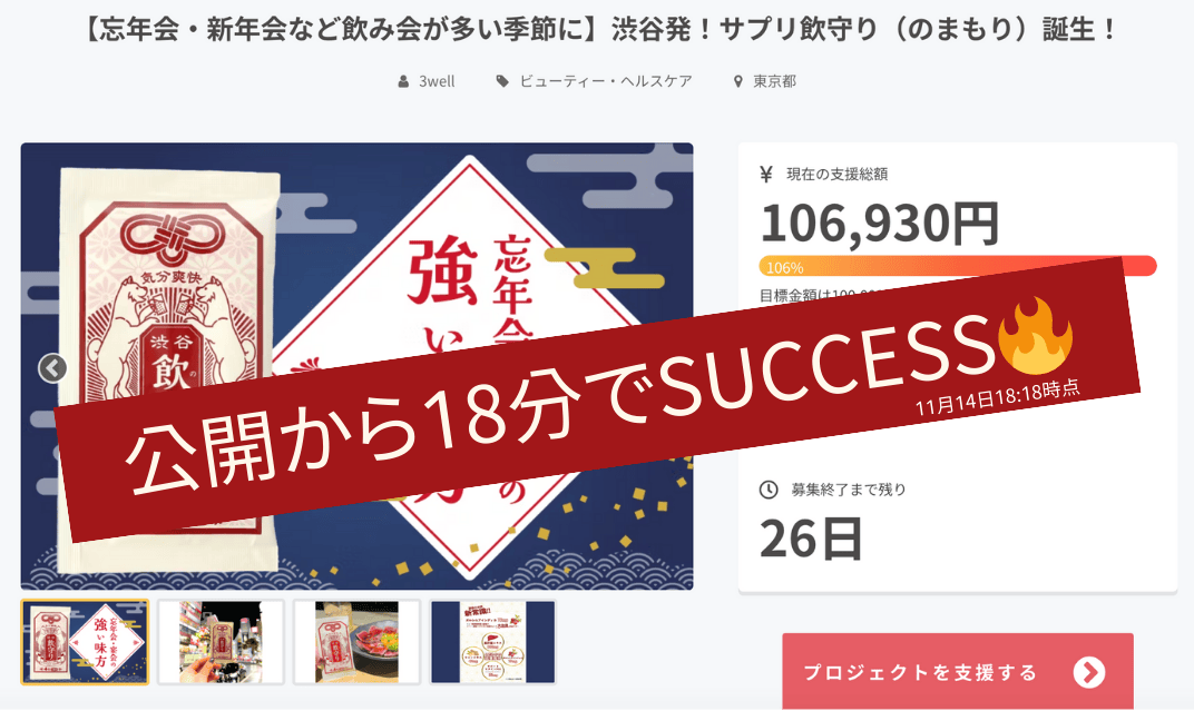 2023/11/15 13:55私たちは渋谷で楽しくお酒を飲む皆さんを応援するため、クラウドファンディングを開始しました!皆さんの熱い支援のおかげもあり、開始からわずか18分で目標額を達成しました!この「飲守り」プロジェクトの目的は、お酒を飲む機会の多い学生さん、社会人の皆さんが、お酒を楽しく飲み、次の日に残さず、快適に一日を過ごせるようサポートすることです。飲守りには、豚肝臓エキスを300mg、ガルシニアインディカ77mgなど、こだわりの成分を厳選して含んでいます。みなさまのご支援のおかげもあり、早期に達成できましたが、また新たな目標を設定し、これからも精一杯努力していきます。「渋谷でお酒を楽しむ全ての人を応援したい」という私たちの想いに共感していただければ幸いです。引き続きのご支援、よろしくお願いいたします! もっと見る