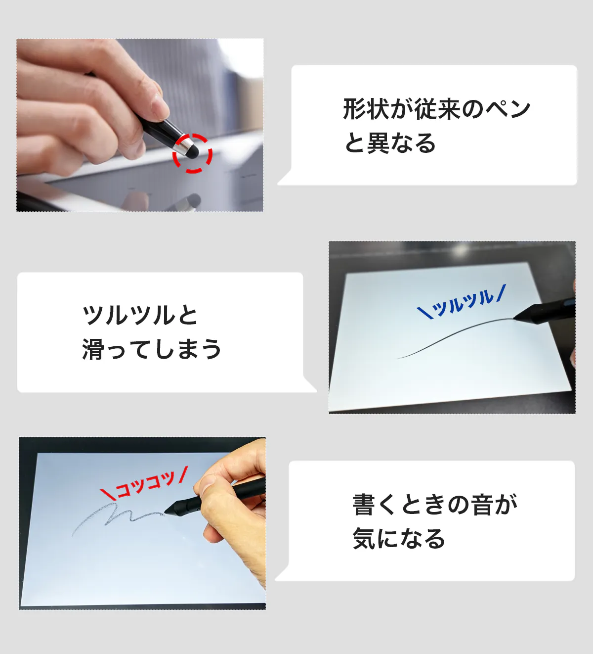 ※「従来の書き心地」とは、私たちが書き慣れているシャープペンやボールペンでの筆記により近い書き心地のことを指しています。そういったペンと形状が同一なことで書きやすい、低摩擦でツルツルと滑りにくい筆記を行うことができるという意味です。