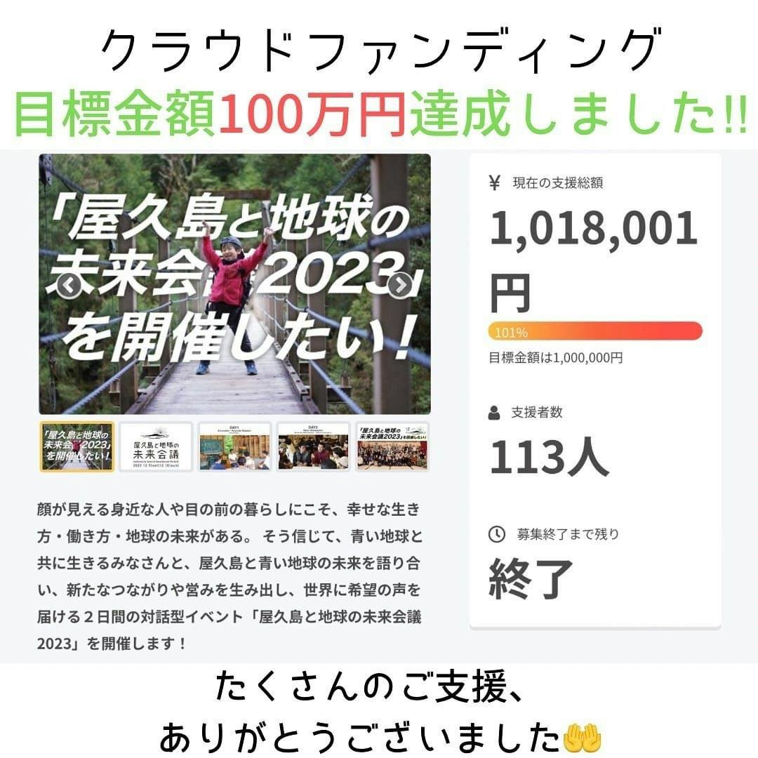 2023/12/20 14:13屋久島と地球の未来会議2023クラウドファンディング終了いたしました。『支援総額 1,018,001円目標達成! 総支援者数 113人』たくさんのご支援、本当にありがとうございました。私たちの想いや取り組みに共感・賛同してくださったみなさまのおかげで、目標金額の100万円をうわまわり、目標を達成することができました。協賛してくださった企業のみなさまおよび個人の方々、また、全国のあらゆるところから応援してくださったみなさま、会場にお越しくださった皆さま、本当にありがとうございました。未来会議当日の様子は、SNS等でご報告させていただきますので、今後ともどうぞよろしくお願いします。Instagramhttps://www.instagram.com/hublaboyakushima?igshid=YzAwZjE1ZTI0Zg%3D%3D&utm_source=qrFacebookhttps://www.facebook.com/HUBLABOYakushima〜 〜 〜 〜 〜 〜 〜 〜 〜 〜 〜 屋久島と地球の未来会議 2023 屋久島と青い地球の未来をつくる仲間を増やし、 地球と人類の宝である屋久島から、 世界に希望の声を届ける。〜 〜 〜 〜 〜 〜 〜 〜 〜 〜 〜 https://hublabo.org/yakushima-conference2023/ もっと見る