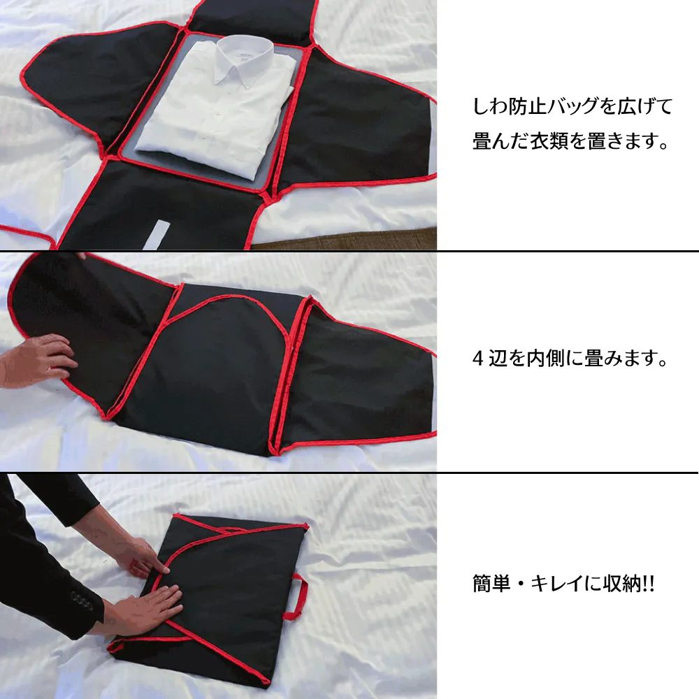 サイズの異なる3つのバッグ(S・M・L)があり、衣類のしわを防ぐ特別なデザインが施されています。