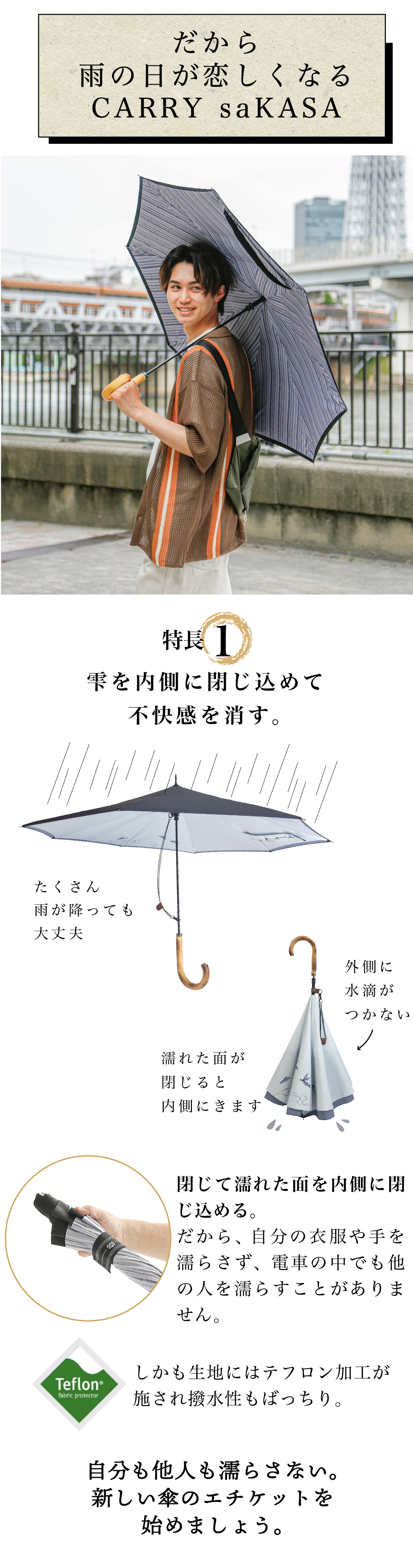 明日の雨を憂鬱と思うのではなく、むしろCARRY saKASAを使う楽しい時間が「待ち遠しい」と思えた瞬間。まさにその時がお客様の心の中で雨のイメージがマイナスからプラスに変化し、我々のミッションが達成された瞬間になるのです。