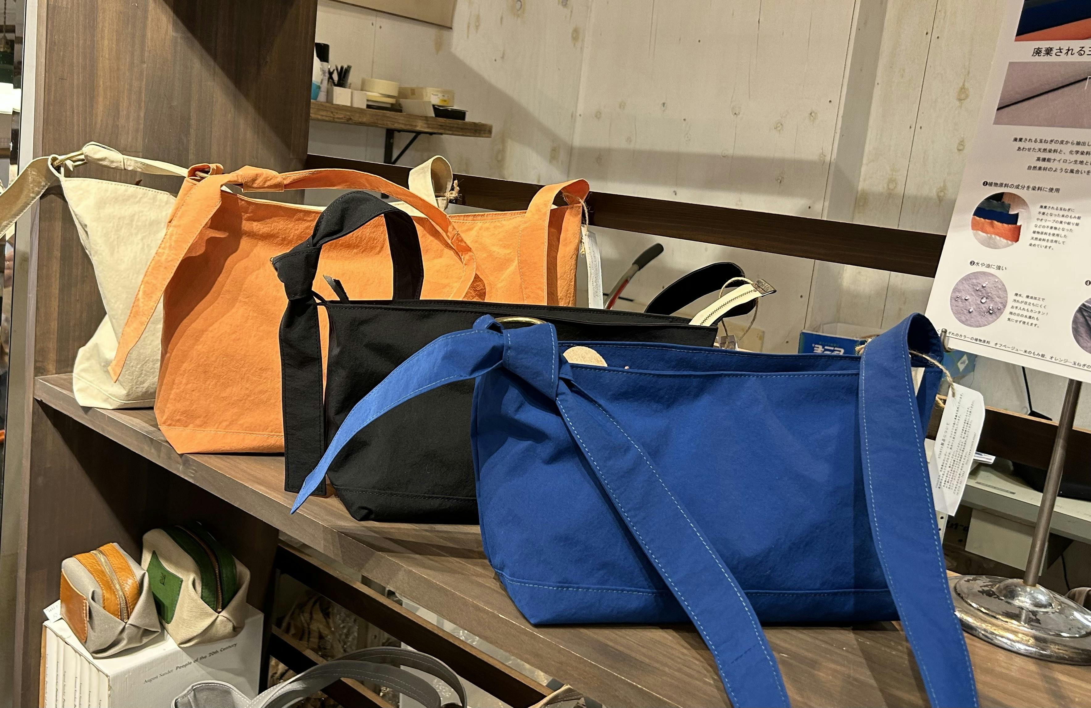 このバッグはSサイズ、Mサイズともに男性女性年齢問わずユーザーが多いのも特徴です。今回はKONBU仕様に持ち手を結ぶことで長さを変えることができるように改良しました。KONBUの薄くても強度のある素材の特性を生かしたデザインです。