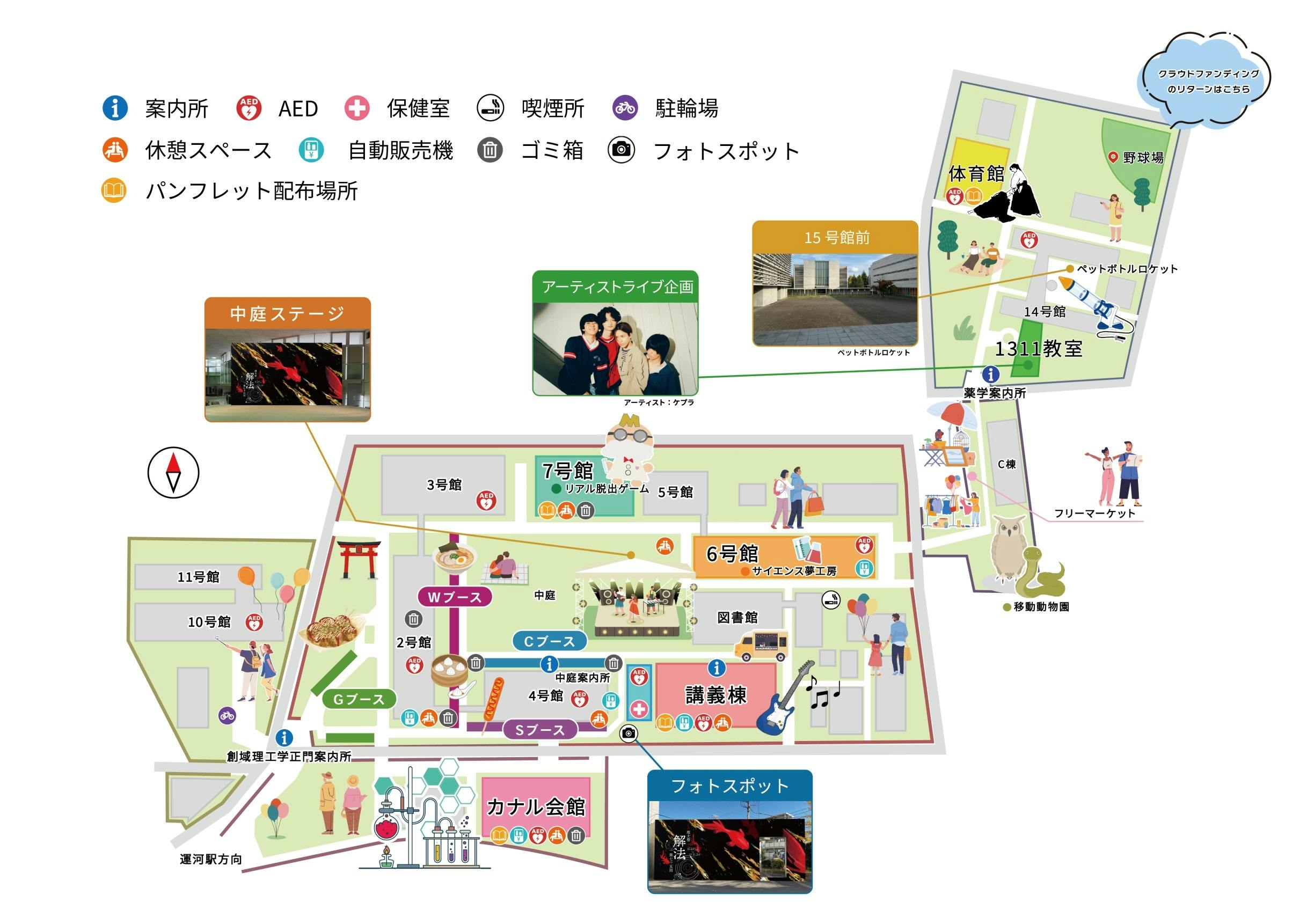 開催地である東京理科大学野田キャンパスは、創域理工学部エリアと薬学部エリアに分かれており、豊かな自然に囲まれた広大なキャンパスです。東京理科大学野田地区理大祭は、このような広大な敷地を存分に活かして開催いたします。