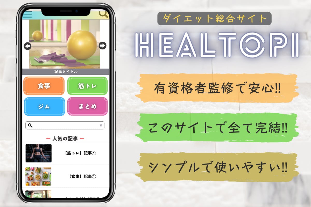 ダイエッター向け総合サイト【HEALTOPI -ヘルトピ-】では誰もが自分自身の身体(healthy)と向き合う時、安心して実践できる情報(topic)を得られるよう、管理栄養士・整体師・トレーナー・プロスポーツ選手・薬剤師をはじめとした有資格者や専門機関に協力していただいて記事を作成し、身体に負荷のかからない、そして継続できる正確なダイエットの情報を発信し、誰もが理想的な身体を実現できるようサポートいたします。