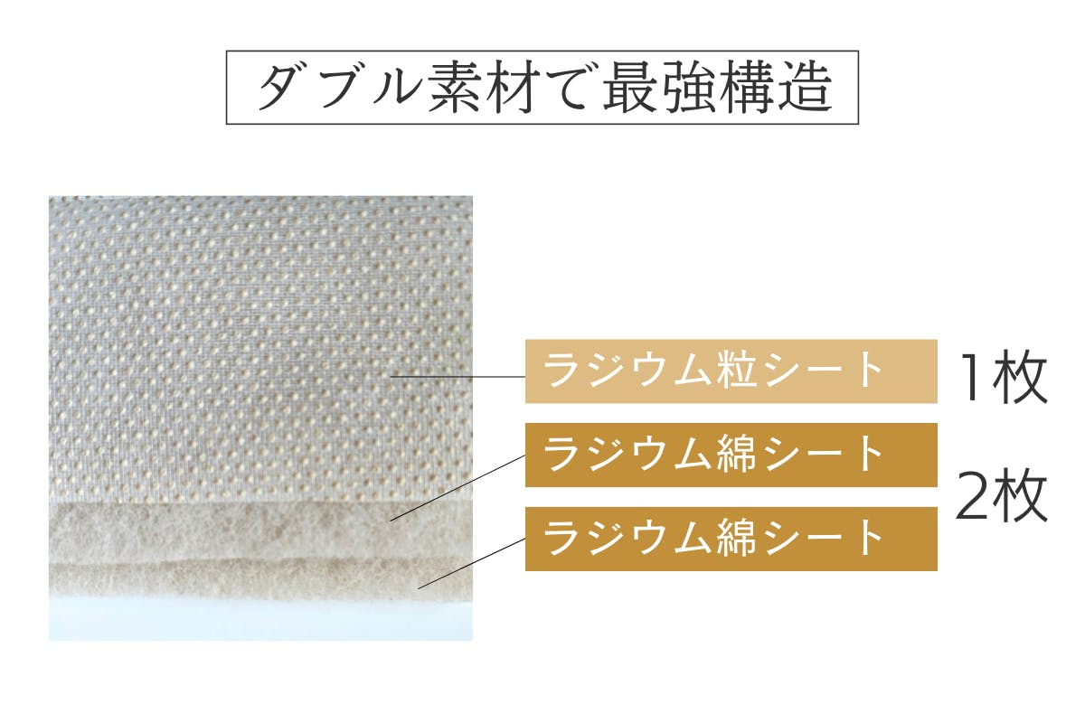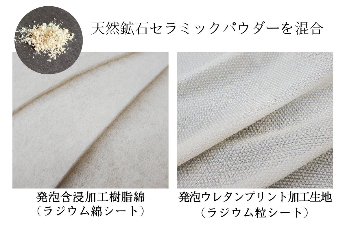 ラジウム粒シートは薄くてドレープ性が高いことから、掛け布団などにも利用することが可能。プリントサイズは小さなドットづくりとなっており、ドーム状に発泡させた事で表面積が増え、効率的に機能性を発揮します。芯地の厚みが薄いため、ラジウム綿シートとの併用によって、ホルミシス効果を高めるために使用しています。
