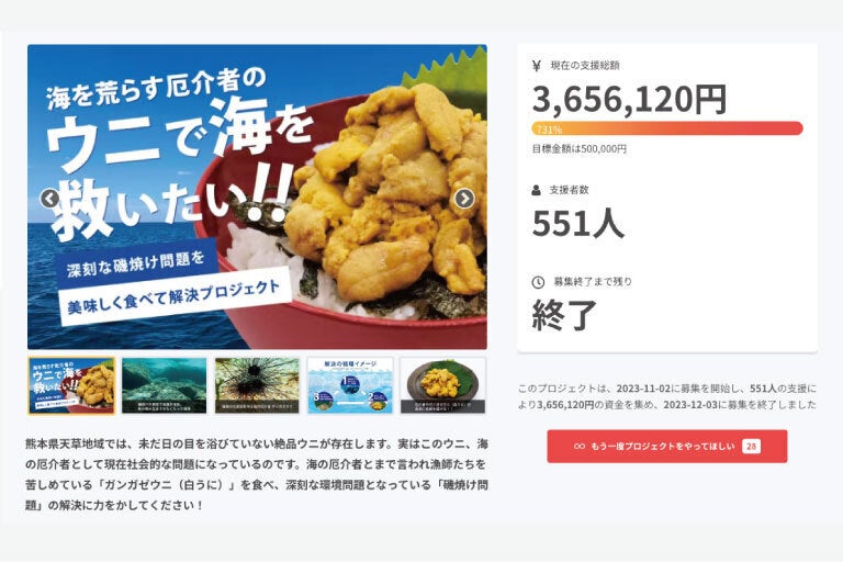 前回は磯焼け問題解決のため「白うに」へのご支援ありがとうございました!!