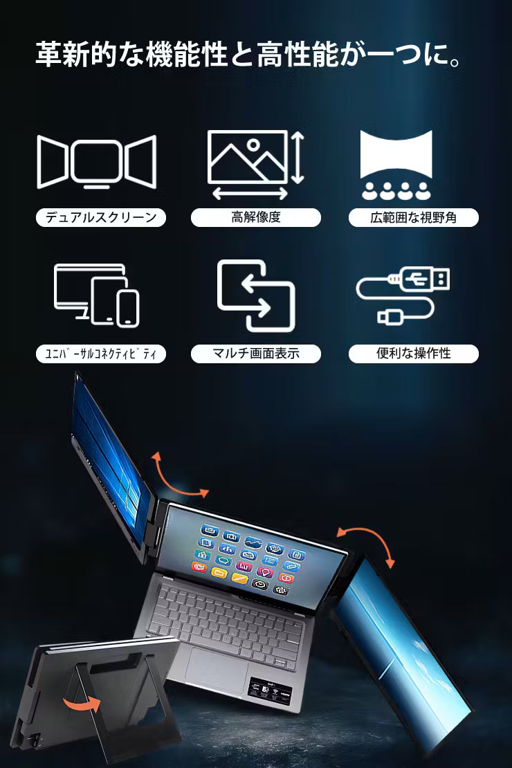 デュアルスクリーン: 14インチ×2のデュアルスクリーンを提供し、3つのモニターで同時に複数のタスクを効率的に行うことが可能。