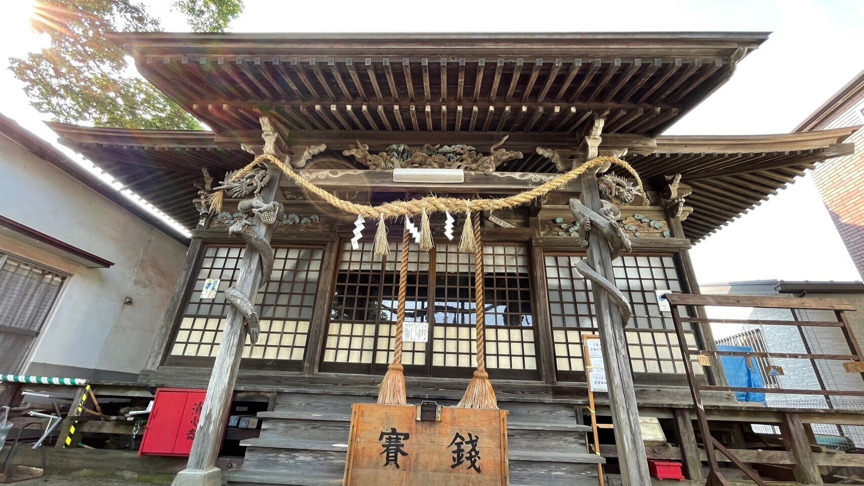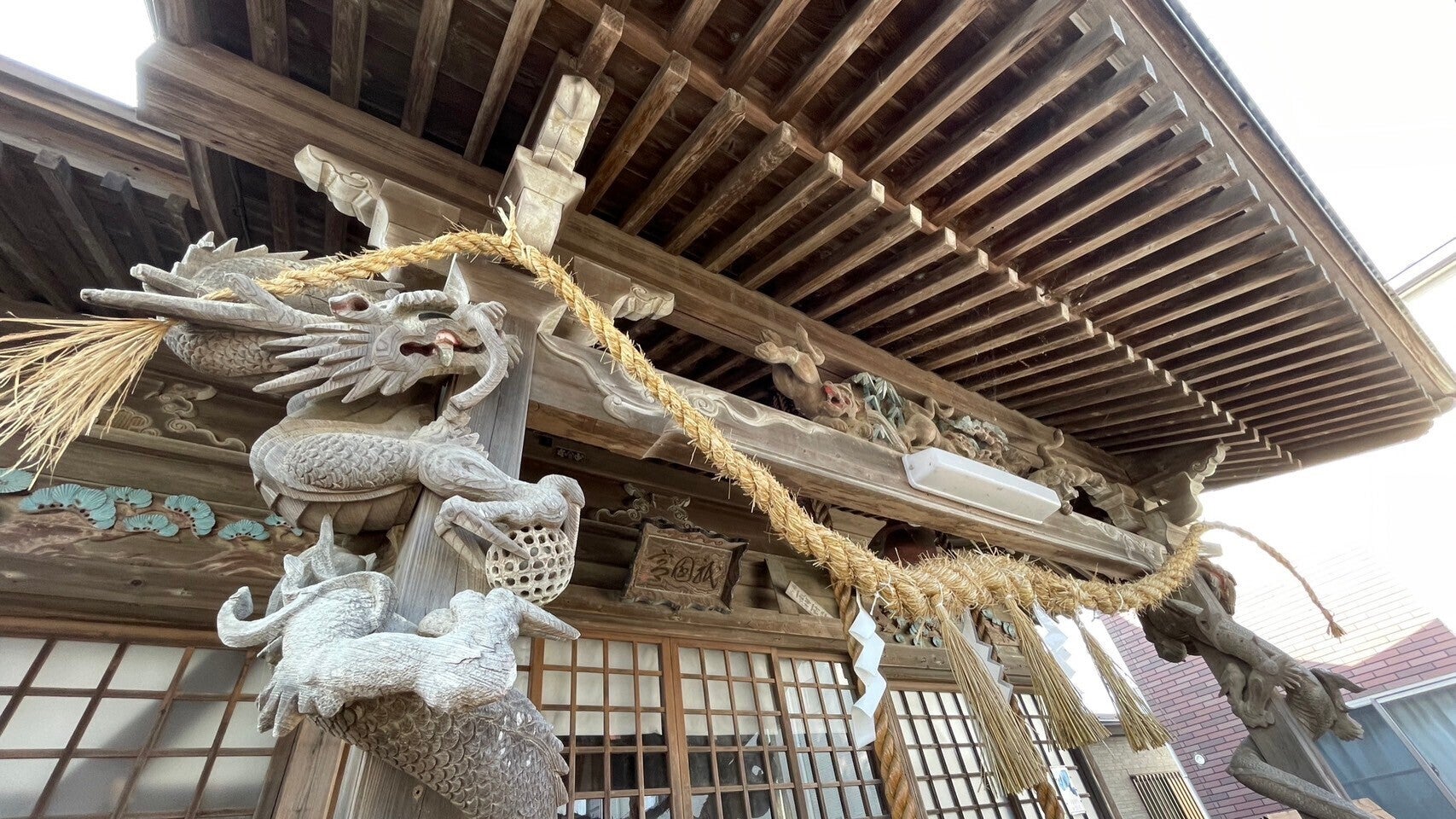 拝殿向拝には一対の昇り龍の彫刻があります。この昇り龍は境内西側にある樹齢800年の欅の枝を使用したもので、龍を掘った作者は名も告げず立ち去ったというドラマチックな伝承が残っています。