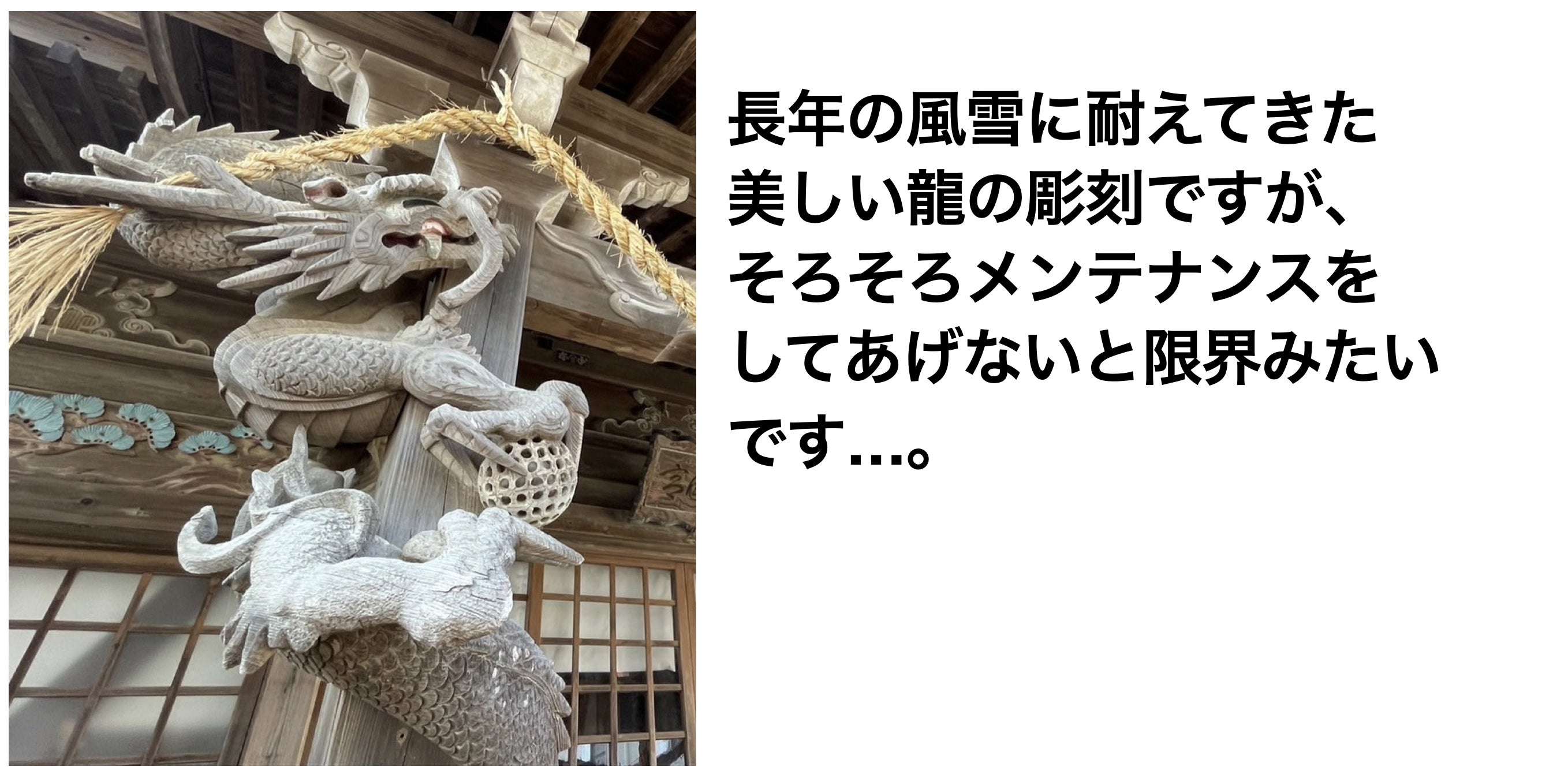 地域の守り神とも言える昇り龍を後世へ残すべく修繕するための費用を集めます。
