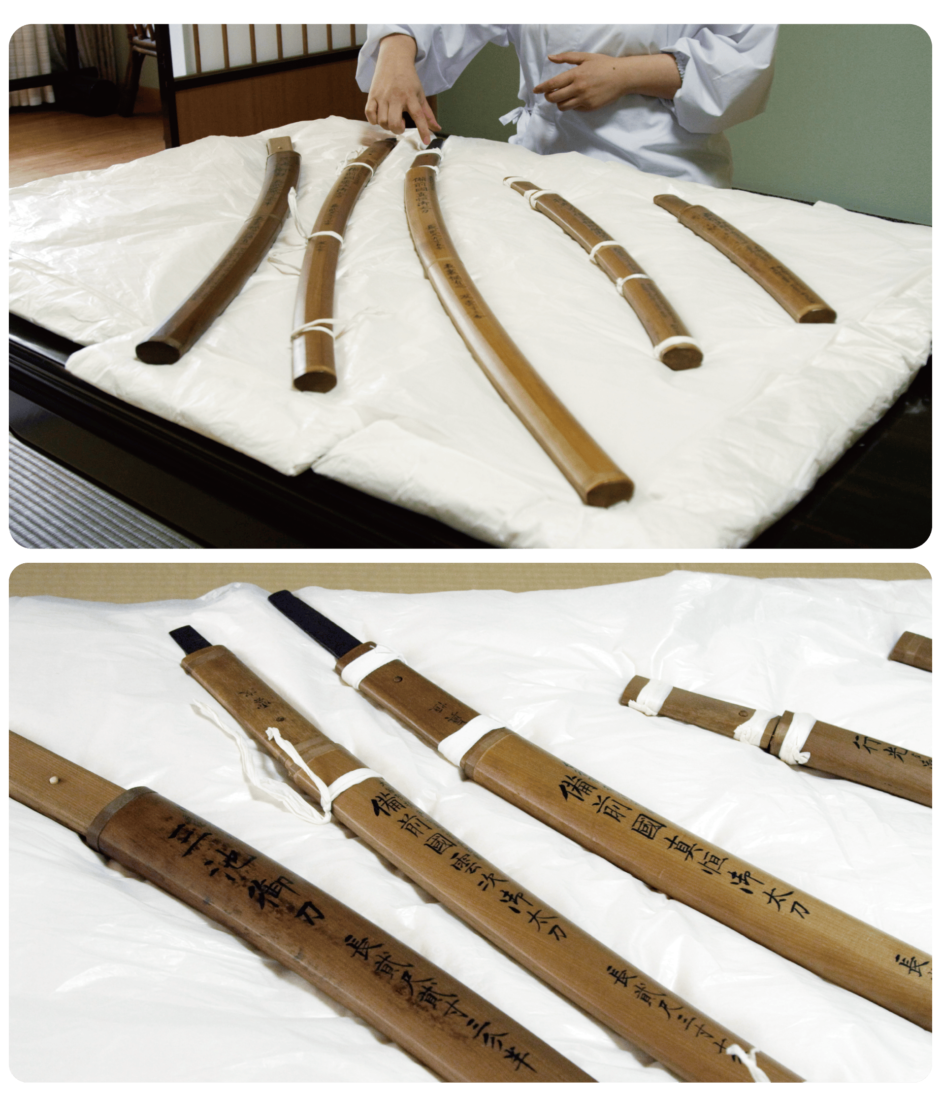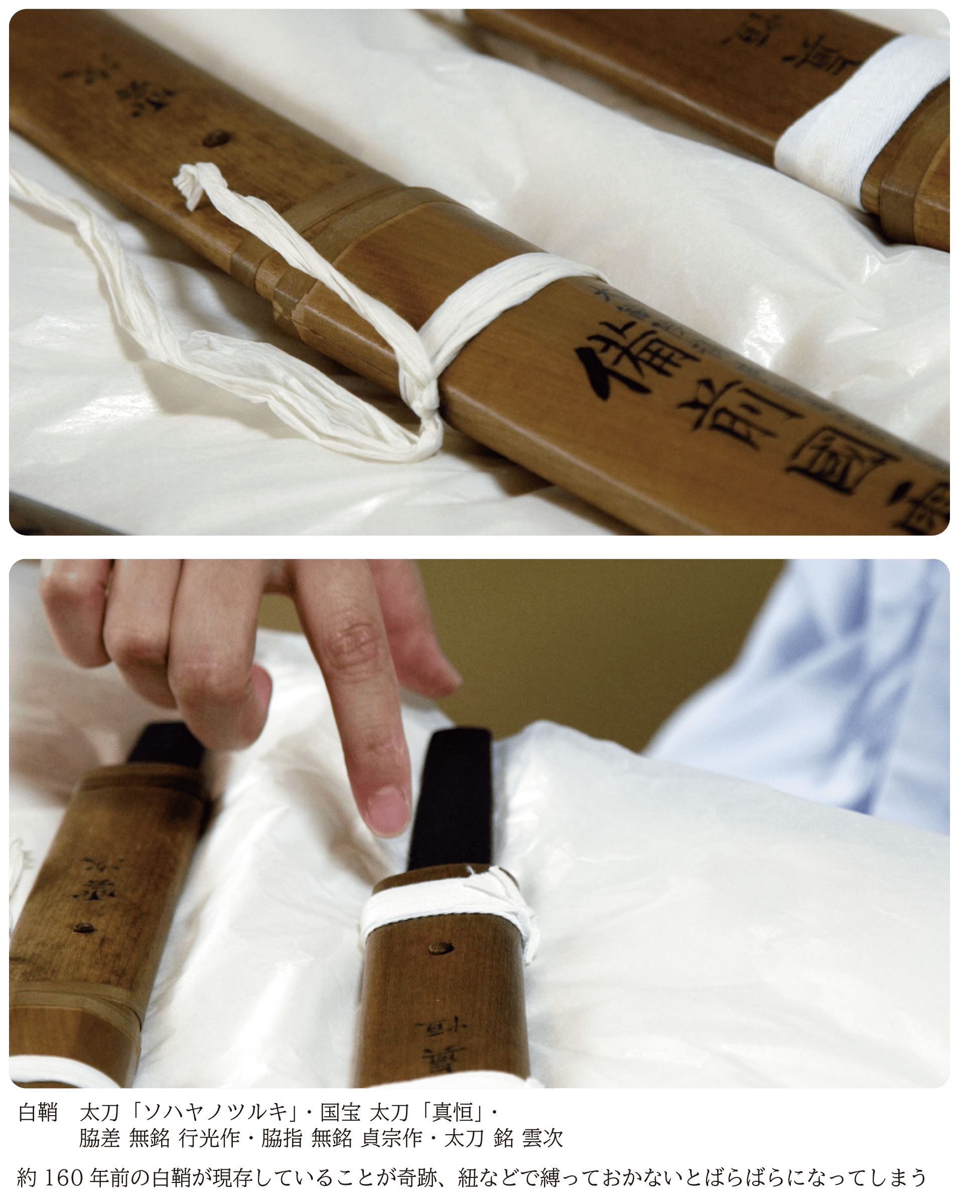 白鞘は通常10年~30年が使用期間のところ約160年ほど経過しており、文化財としての価値が非常に高い一方、奇跡と言われるほど長い期間を使用しているため、紐などで縛っておかないとばらばらになってしまう上、刀身を保管する上で、錆や劣化から守る最も重要な役割を果たしているため、刀身そのものに深刻なダメージを与えかねない状況です。白鞘は一度に新調することができないため、今回は5カ年計画で14口の白鞘を新調いたします。その間にも老朽化は進行していくため、一刻も早く着手していく必要があります。