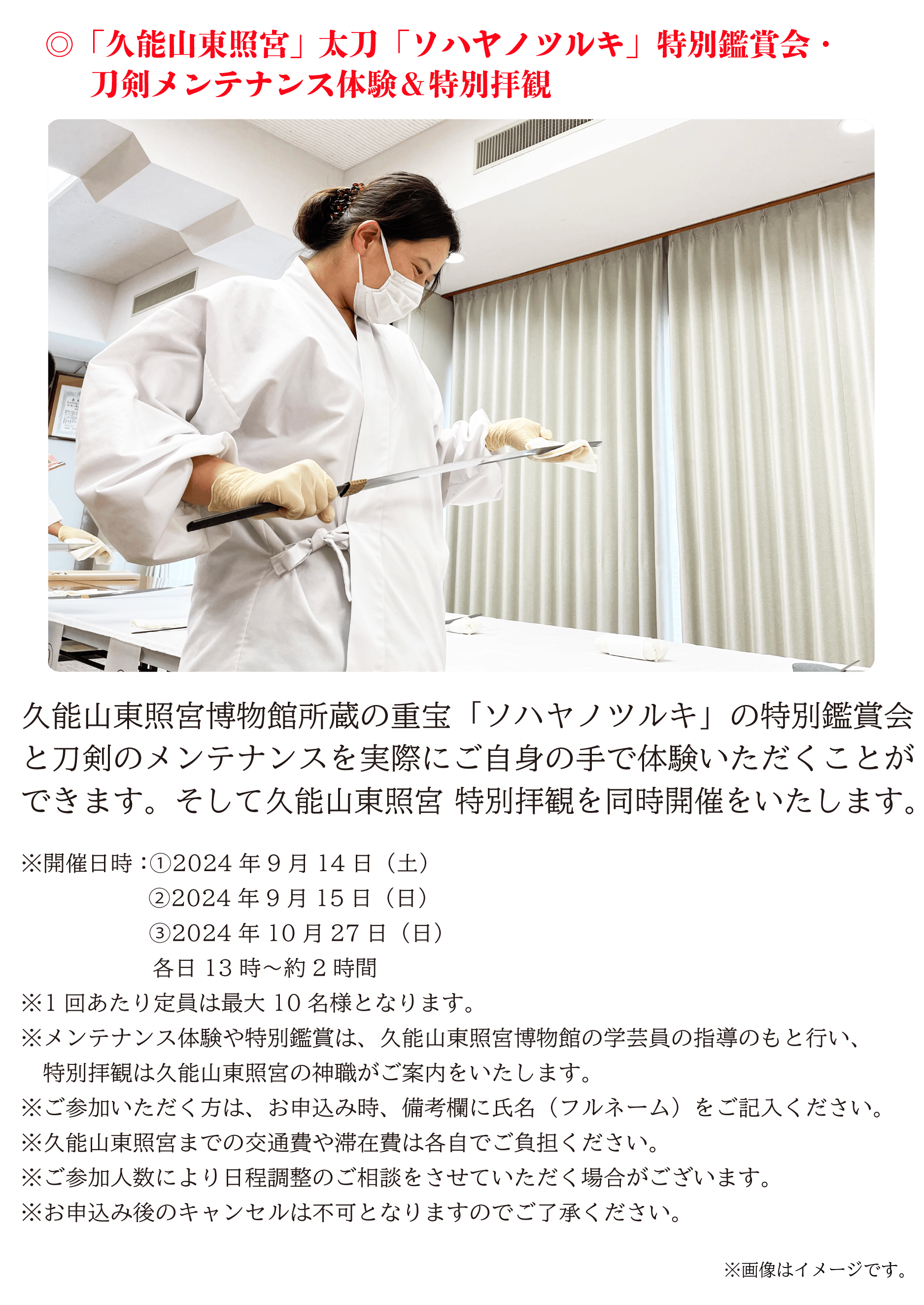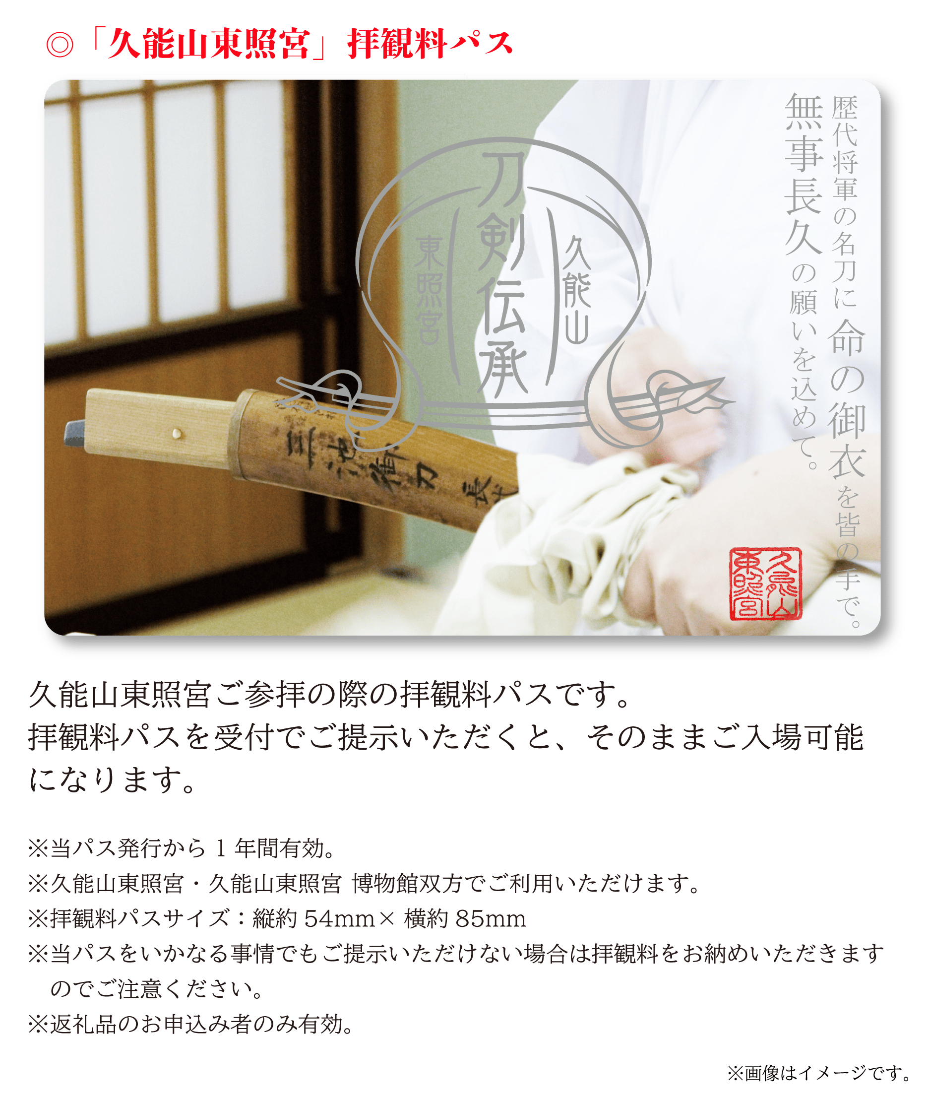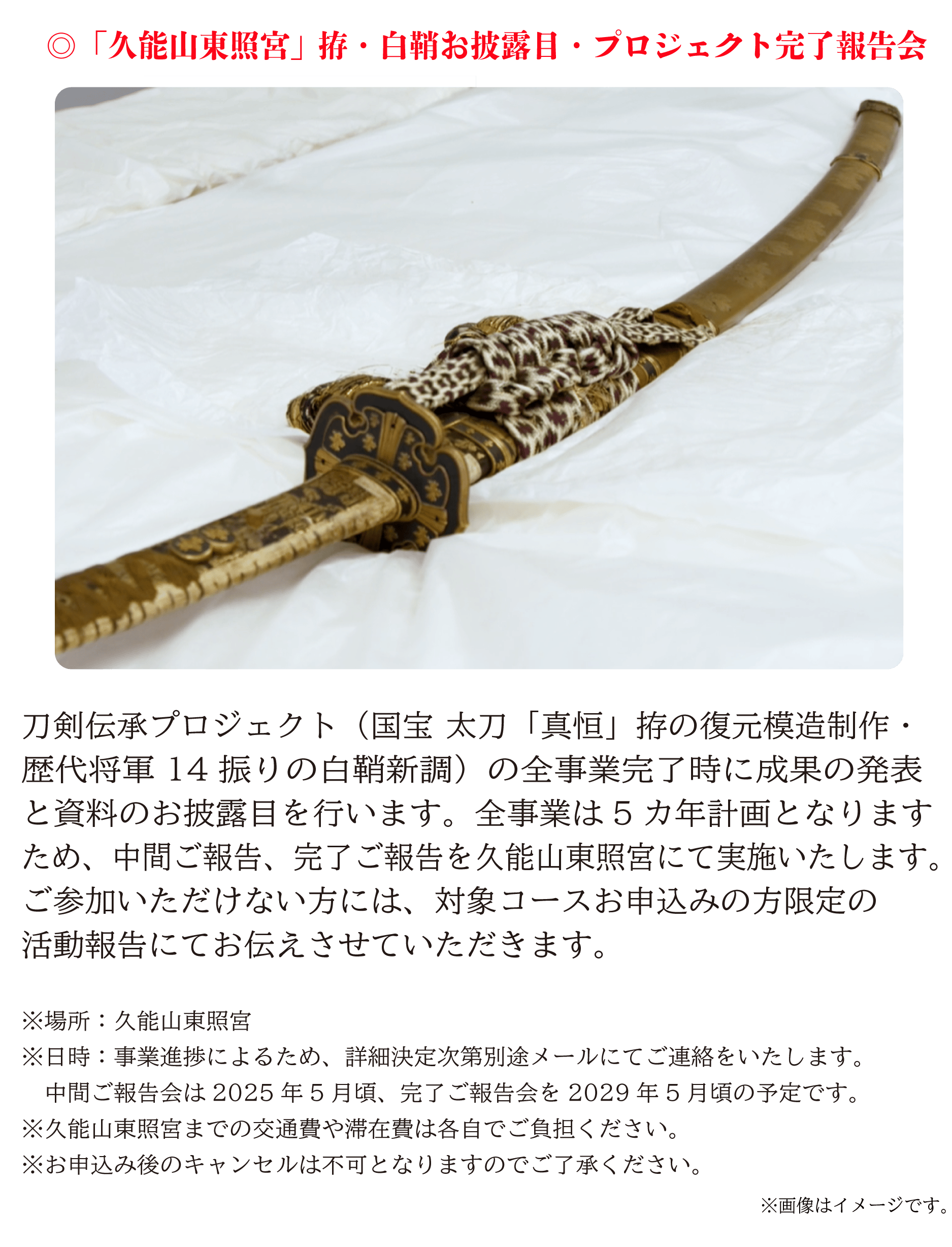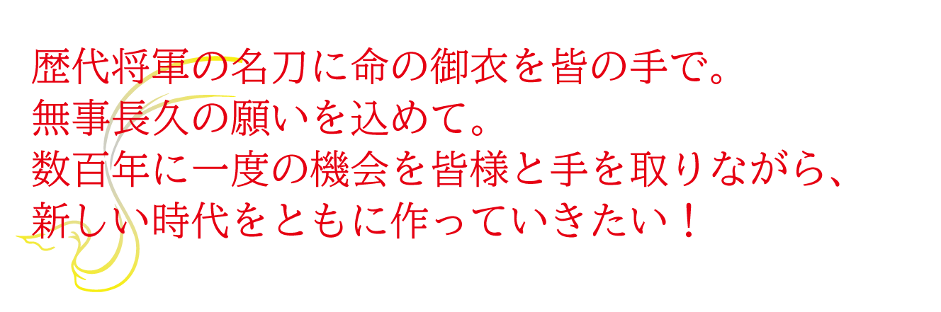 久能山東照宮は、刀剣のまことの輝きと命脈を永遠のものとするために、未知への挑戦に一緒に参加をしてくださる方々を全国から募集いたします。そして数百年に一度の機会を皆様と手を取りながら、新しい時代をともに作っていければと思っております。