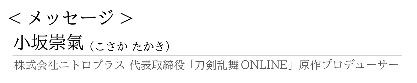 ゲームやアニメを制作している株式会社ニトロプラスの小坂 崇氣(こさか たかき)と申します。私は刀剣を題材にした「刀剣乱舞(とうけんらんぶ)ONLINE」というゲームの原作プロデューサーをしております。