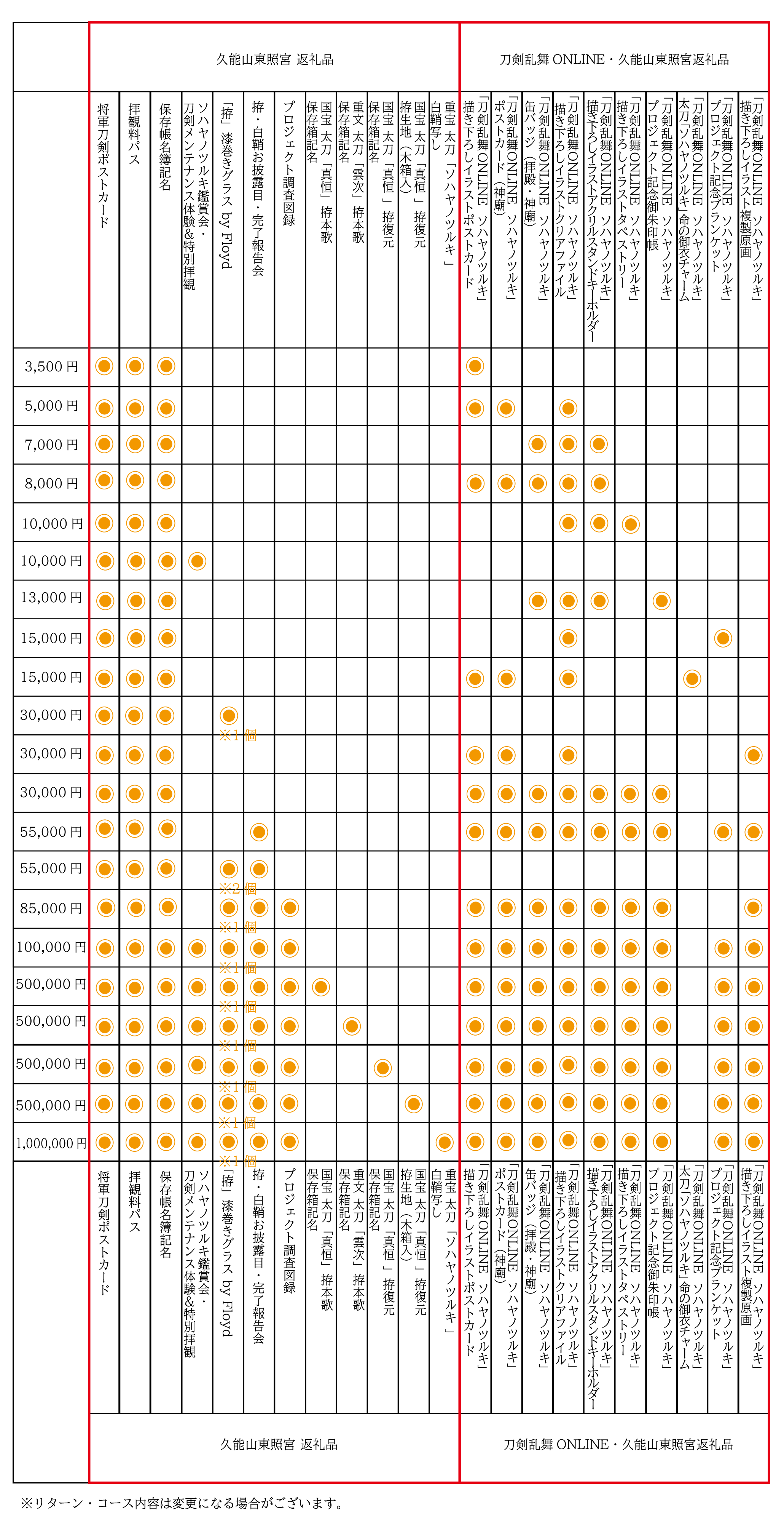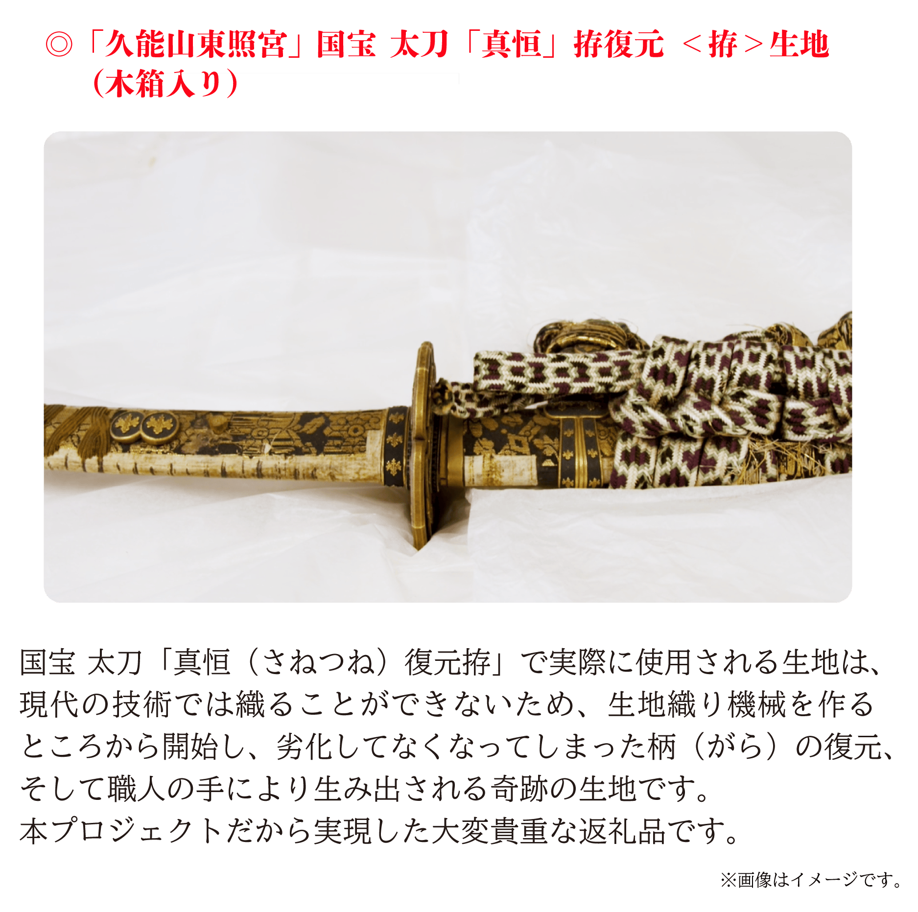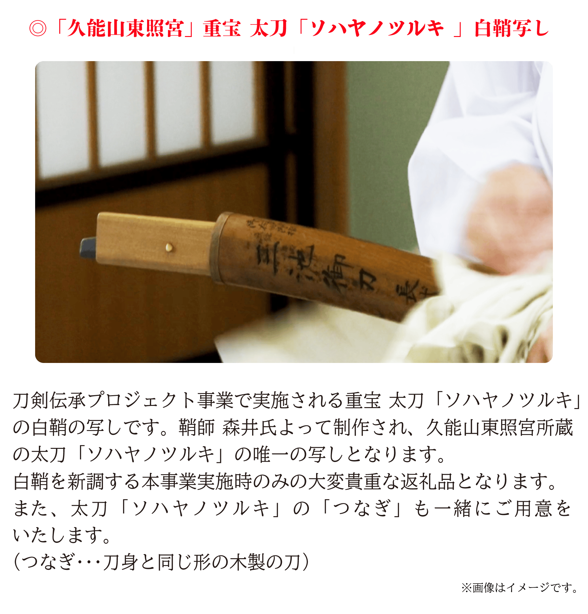 リターン(返礼品)は本企画だから実現できる、久能山東照宮の重宝 太刀「ソハヤノツルキ」白鞘の写しや実際に国宝 太刀「真恒(さねつね)」拵の復元模造に使用する拵(こしらえ)の生地、そして職人・アーティストがチームとして集う株式会社studio仕組やプロダクトレーベル「Floyd(フロイド)」がプロデュースした「久能山東照宮」返礼品の他、イラストレーター三輪士郎さんによる「刀剣乱舞ONLINE」の刀剣男士「ソハヤノツルキ」プロジェクト記念描き下ろしイラストを使用した特別返礼品など全21コースをご用意いたしました。