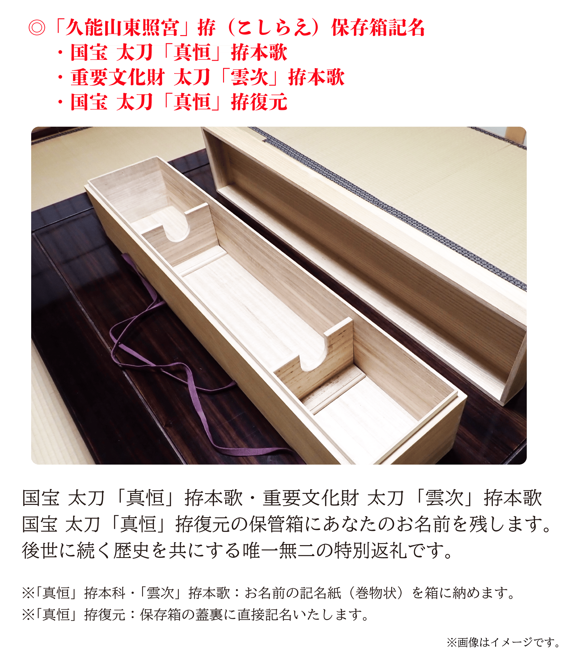 2025/03/22 16:59この度は【久能山東照宮『刀剣伝承』~ソハヤノツルキなど歴代将軍の名刀に命の御衣を皆の手で~】にご支援をいただきまして誠にありがとうございます。支援者の皆様には先日ご報告させて頂きましたが、この度、皆様にご支援頂きました白鞘の新調事業の第一弾、及び太刀拵の保存箱の製作が完了しました。白鞘の新調事業は今年度より5ヶ年で行う予定で、今年度はその中から・国宝 太刀 銘 真恒・重要文化財 太刀 銘 雲次の白鞘の新調、及び両太刀の拵の保存箱を製作致しました。白鞘は普段展示では見られないものですので、こちらはお写真にて公開させて頂きます。国宝 太刀 銘 真恒白鞘(上が旧白鞘、下が新調されたもの)重要文化財 太刀 銘 雲次白鞘(上が旧白鞘、下が新調されたもの)これまで使用していた白鞘は、今から約160年前、江戸時代末期に作られたものを使用していました。しかし経年の劣化により刀身の保護が難しい状況になった事からこの度、白鞘を新調する事となりました。そして今年度白鞘を新調した2口に附属する太刀拵は当宮所蔵の太刀拵の中でも比較的古い時代に製作された為、状態の劣化が進んでおります。そこでより安全に保管をする為の箱が製作され、今後は展示にも活用出来る様にして頂きました。国宝 桐紋絲巻太刀拵(真恒拵)保存箱※桐葵紋絲巻太刀拵(雲次拵)も同様の保存箱です。江戸時代末期に製作された旧白鞘は大切に保存し、今回新たに製作された白鞘にて刀身を保護して参ります。残りの4年で他の重要文化財の刀剣の白鞘を順次新調致します。(太刀拵の保存箱の製作は本年度のみです)今後太刀拵、及び旧白鞘の展示と共に、特定のコースにてご支援頂きました皆さまに向けての報告会を開催予定です。展示についての情報は当宮ホームページ、または公式X(旧Twitter)でご確認ください。 もっと見る