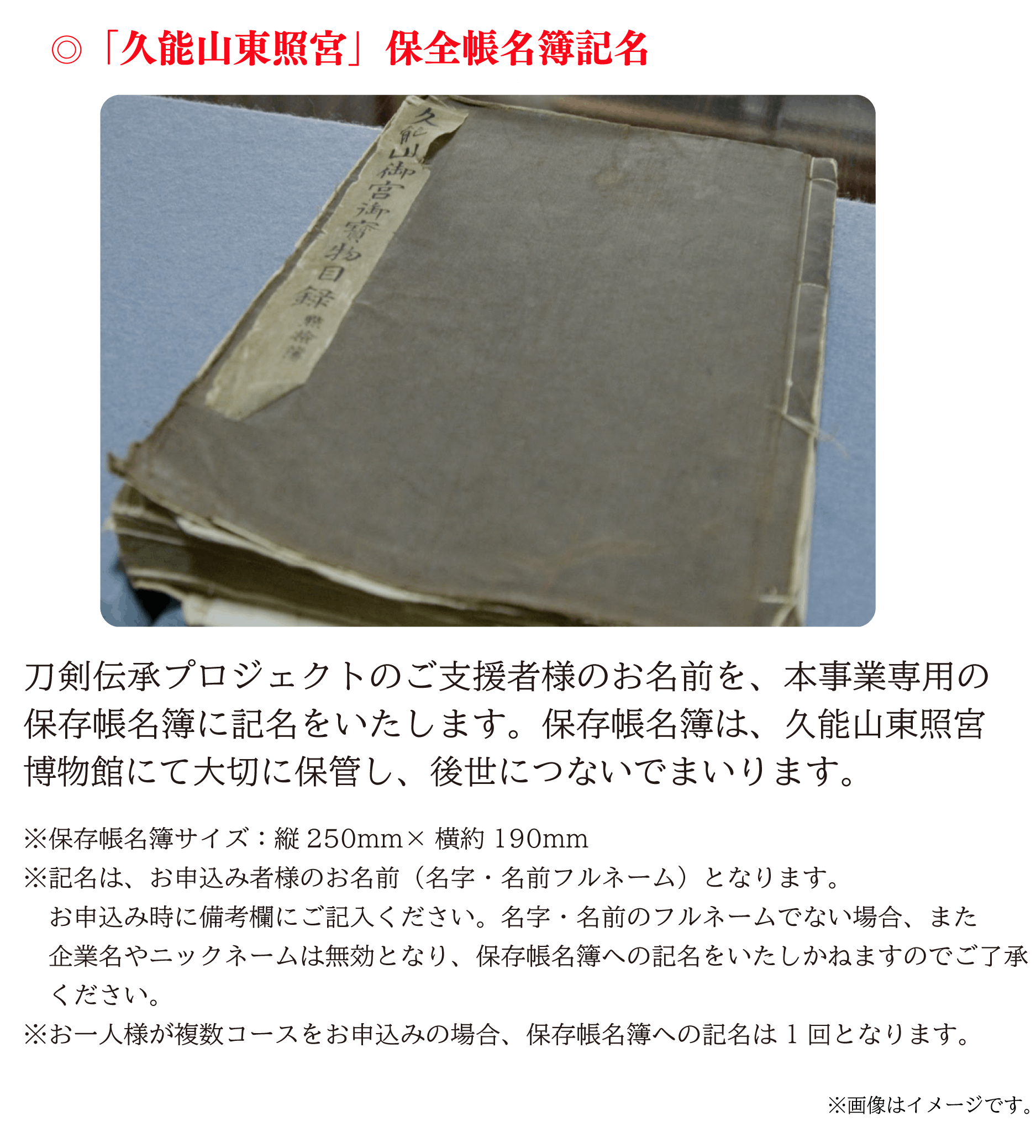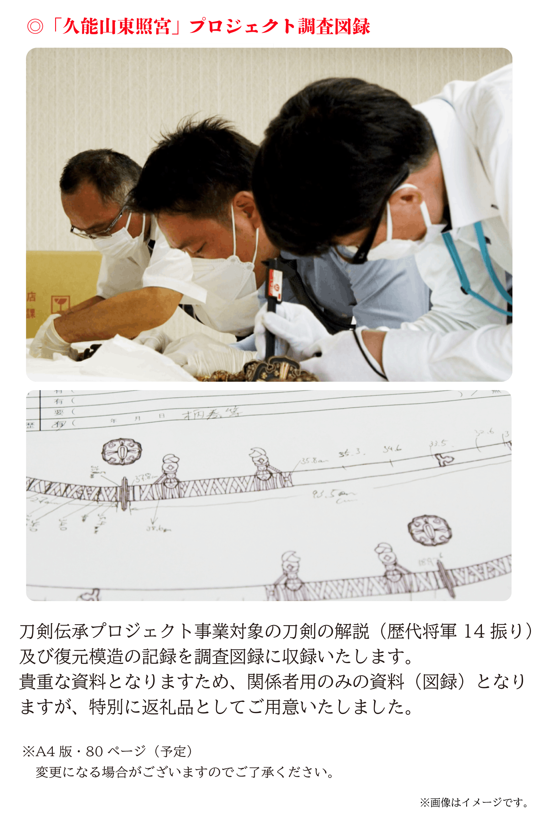 久能山東照宮は、刀剣のまことの輝きと命脈を永遠のものとするために、未知への挑戦に一緒に参加をしてくださる方々を全国から募集いたします。そして数百年に一度の機会を皆様と手を取りながら、新しい時代をともに作っていければと思っております。