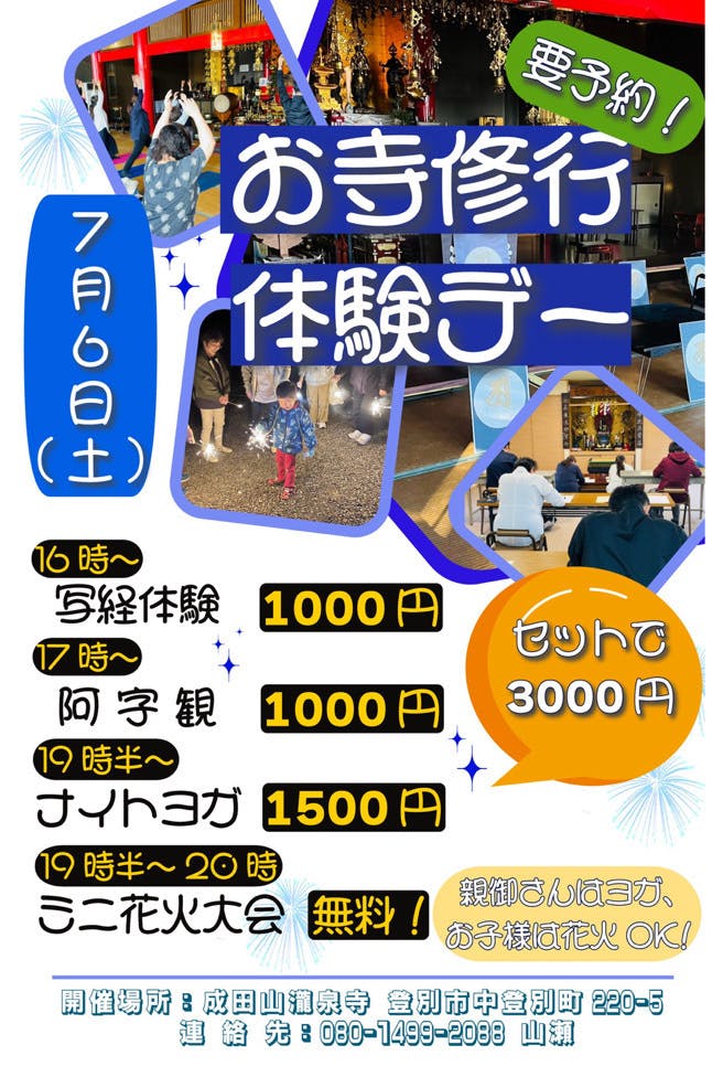 2024/06/18 23:06しばらく投稿を怠り申し訳ありませんm(__)m4月より月1回のお寺修行体験デーを設けています。次回7月は第4回目。ただいま予約受付中!クラウドファンディングにご協力いただいた皆様の中で、写経、ヨガ、阿字観をリターンにくれた方は無料になります。・ご予約はDM等にご連絡下さい!▶︎7月6日(土)16時〜20時16時〜 写経体験17時〜 阿字観(瞑想)19時半〜 ナイトヨガ19時半〜 プチ花火大会※親御さんがヨガの最中、お子様は花火でお楽しみ。もちろん、その逆でも(笑)花火大会と言っても、手持ち花火がメインです。普段近所に遠慮して大声出せない方も、この時ばかりは、気兼ねなくお楽しみください!スペシャル花火も用意しています!・所要時間 各約1時間写経1人1,000円阿字観1人1,000円お寺ヨガ1人1,500円3つまとめて受けると3,000円・▶お寺でバーベキューお寺修行体験の待ち時間に、ご自由にお寺でバーベキューしてください!道具一式はご持参願います。ゴミはお持ち帰りください!・このお寺修行での体験料(=お布施)は、「地域とつながり 孤立をふせぐ ご縁つながるお寺つくり」の改修費に当てられます。修行の功徳を積むことで、人と人がつながる居場所つくりの発展に!ご協力よろしくお願いします(^人^)追伸リターンに「お名前ポエム」を選んでくださった皆様。大変申し訳ありませんが、諸事情により発送が大変遅れています。必ずお送りしますので、今しばらくお待ちください。本当に申し訳ありません。 もっと見る