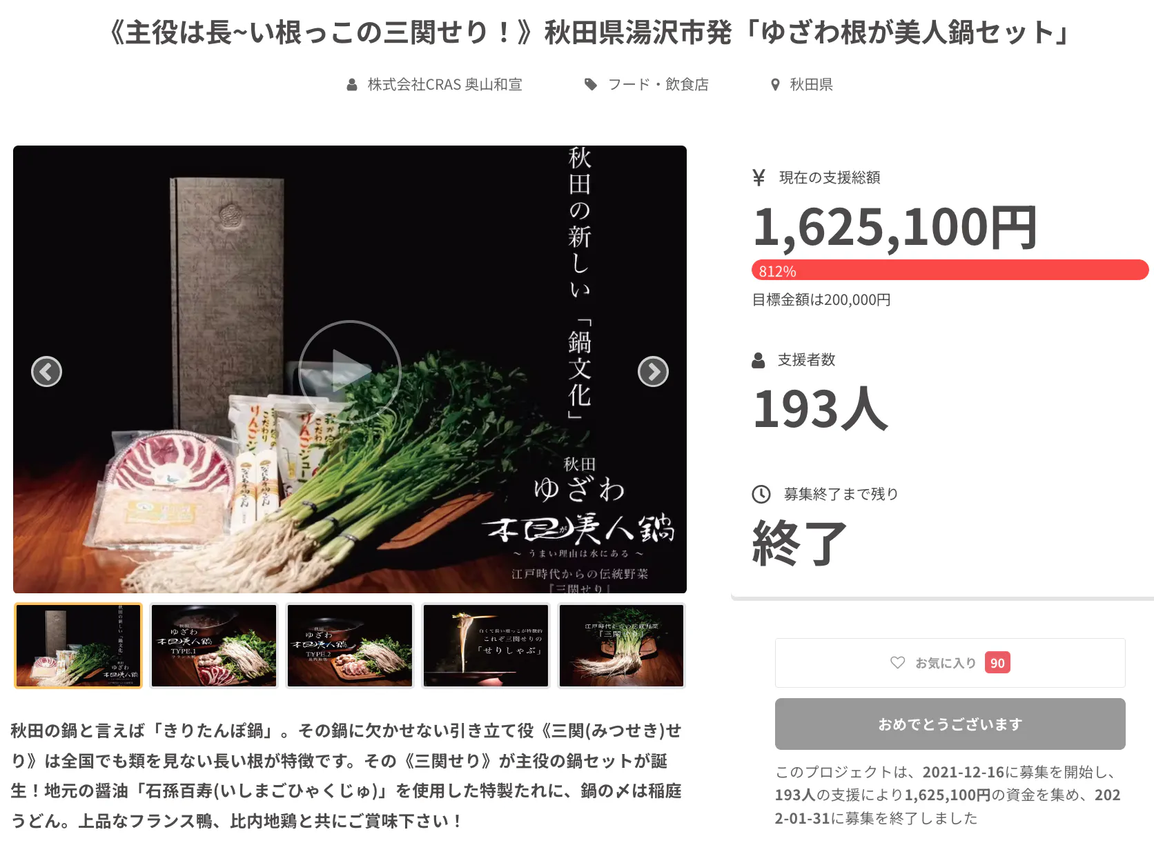 全国でも「せり鍋ブーム」の今こそ、真っ白く長い根と、他の食材に負けない香りと個性を持った、《三関せり》が主役の鍋セットを全国に届けたい!という想いでクラウドファンディングに挑戦しました。結果は・・・