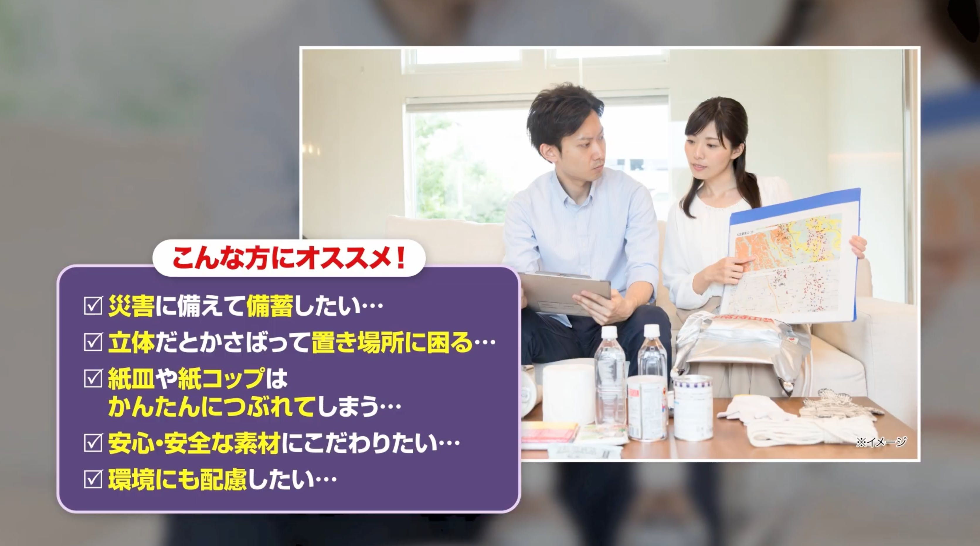 もうそんな思いをさせたくない!限られた備蓄スペースを「折り紙食器 beak」を使って少しでも広くしたいと考えています。