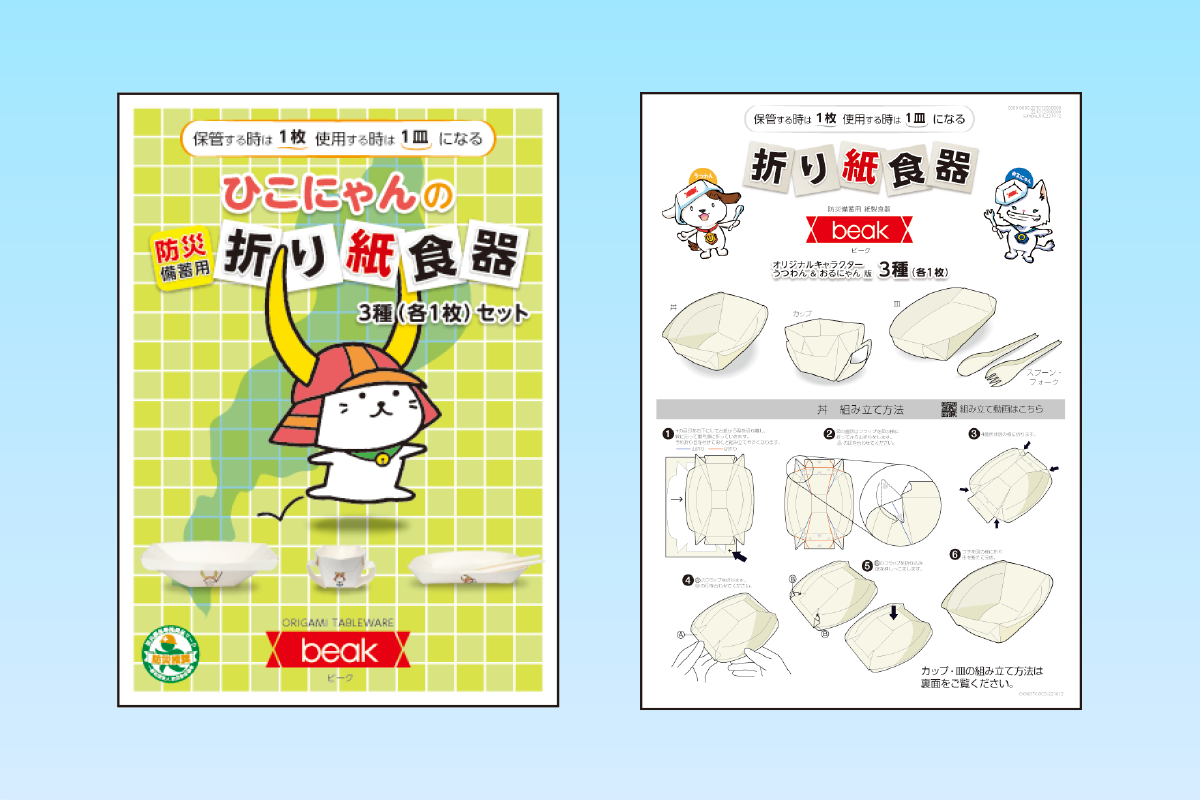 現在は、beakのロゴマークが印刷された製品を中心にご案内をしていましたが、2024年より滋賀県彦根市の公式キャラクター「ひこにゃん」や弊社オリジナルキャラクター「うつわん&おるにゃん」のイラストが印刷されたbeakも用意しましたので、様々な方面から「折り紙食器 beak」を知っていただくことで、防災・備蓄に関する意識を高めていければと考えています。