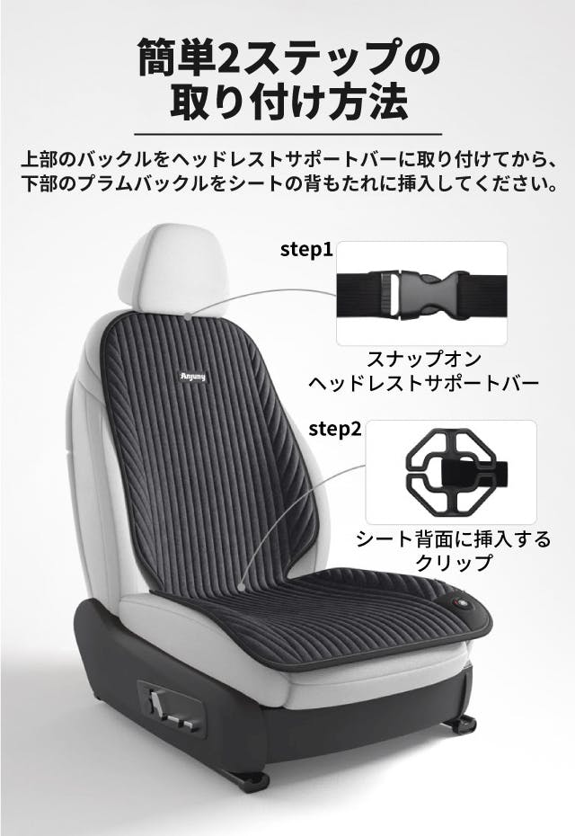 A:ほぼ全ての車種に対応しています(ヘッドレストおよび背もたれと座面の隙間にバックルで取り付けます)