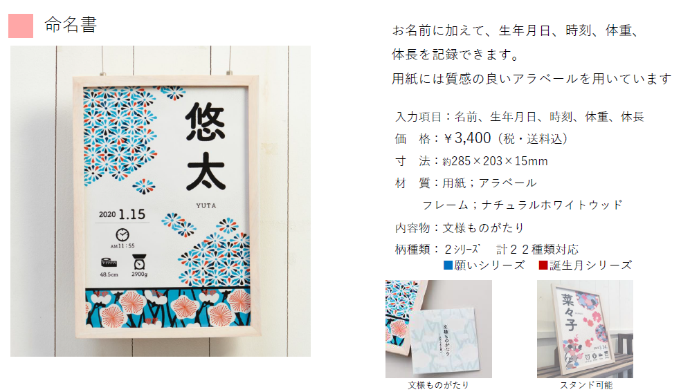 お子様が幸せに育つように願いを込めて2シリーズ全22種類の柄をご用意しております。伝統文様を鮮やかな色でデザインしました。「想い」や「誕生月」に合わせて柄をお選びいただけます。お好きな柄をお選びください。