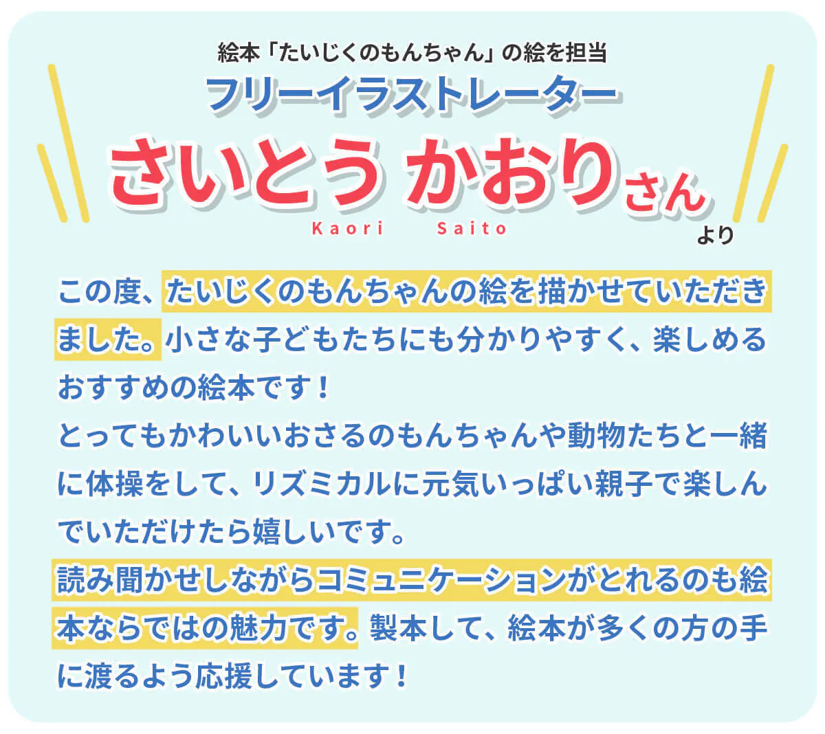 また、絵本たいじくのもんちゃんを通じて、親子のかけがえのないコミュニケーション、スキンシップの一助になって頂けたらこんな嬉しいことはありません。