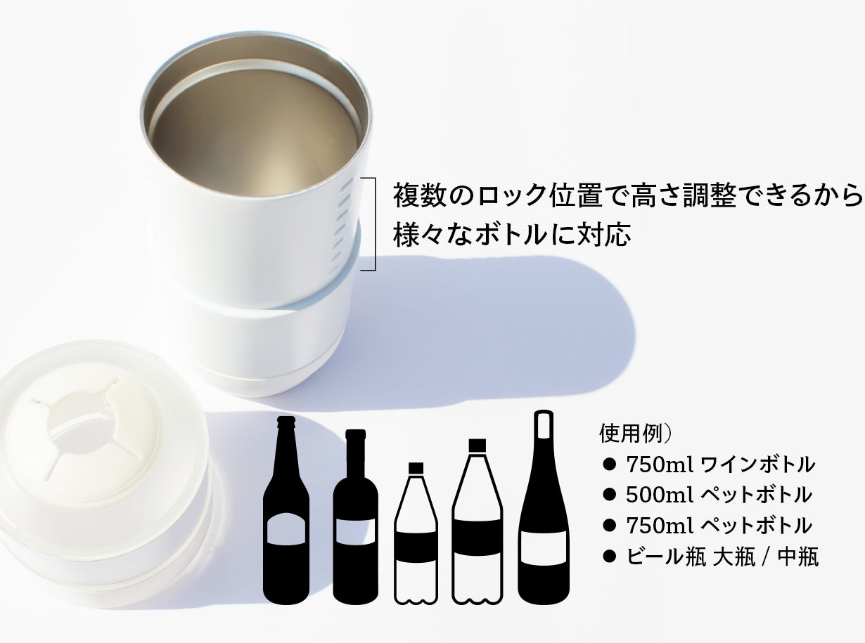 アウトドアやBBQでも活躍し、ワインだけでなくペットボトルや瓶ビールなど様々なボトルに対応します。