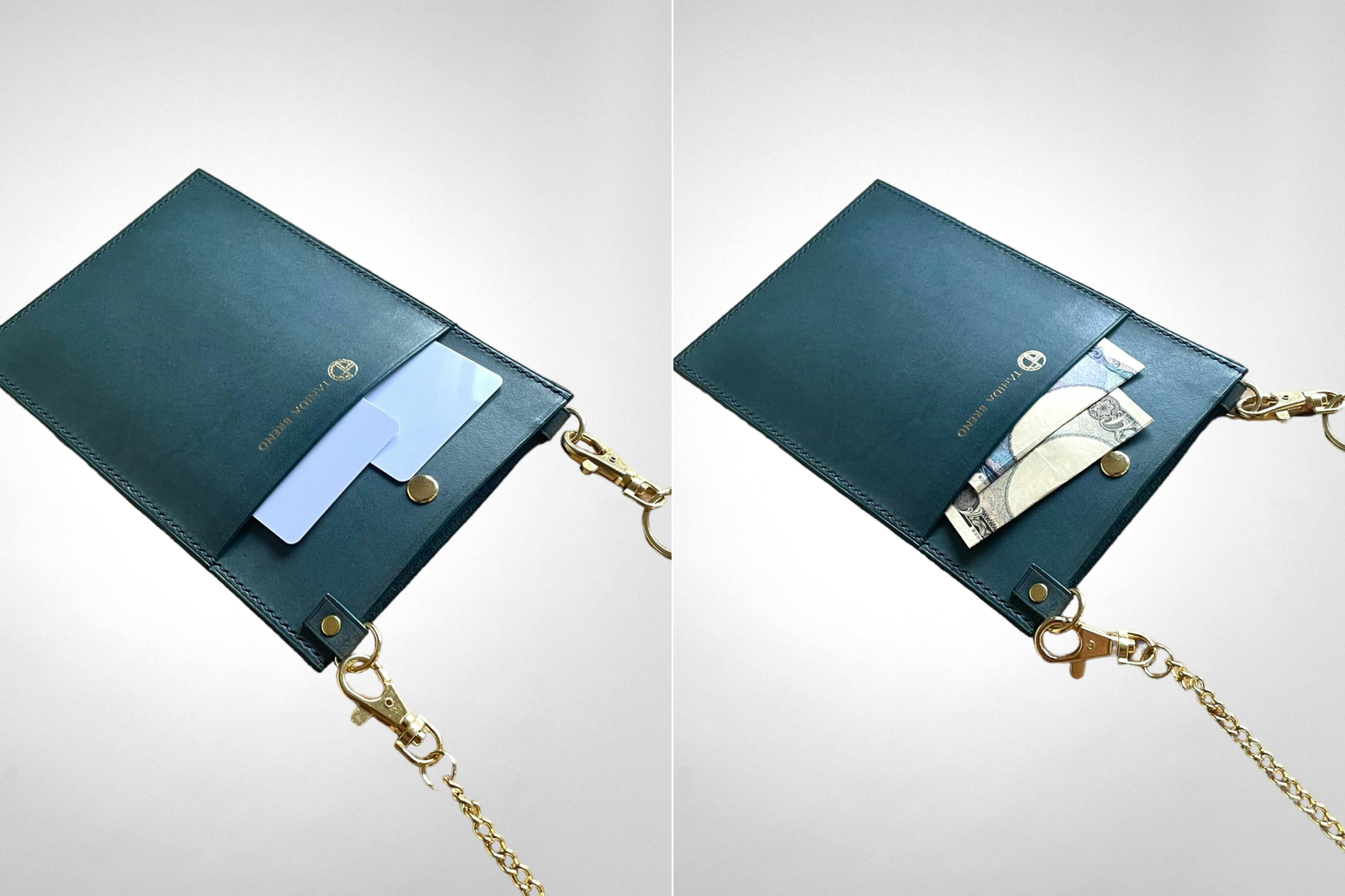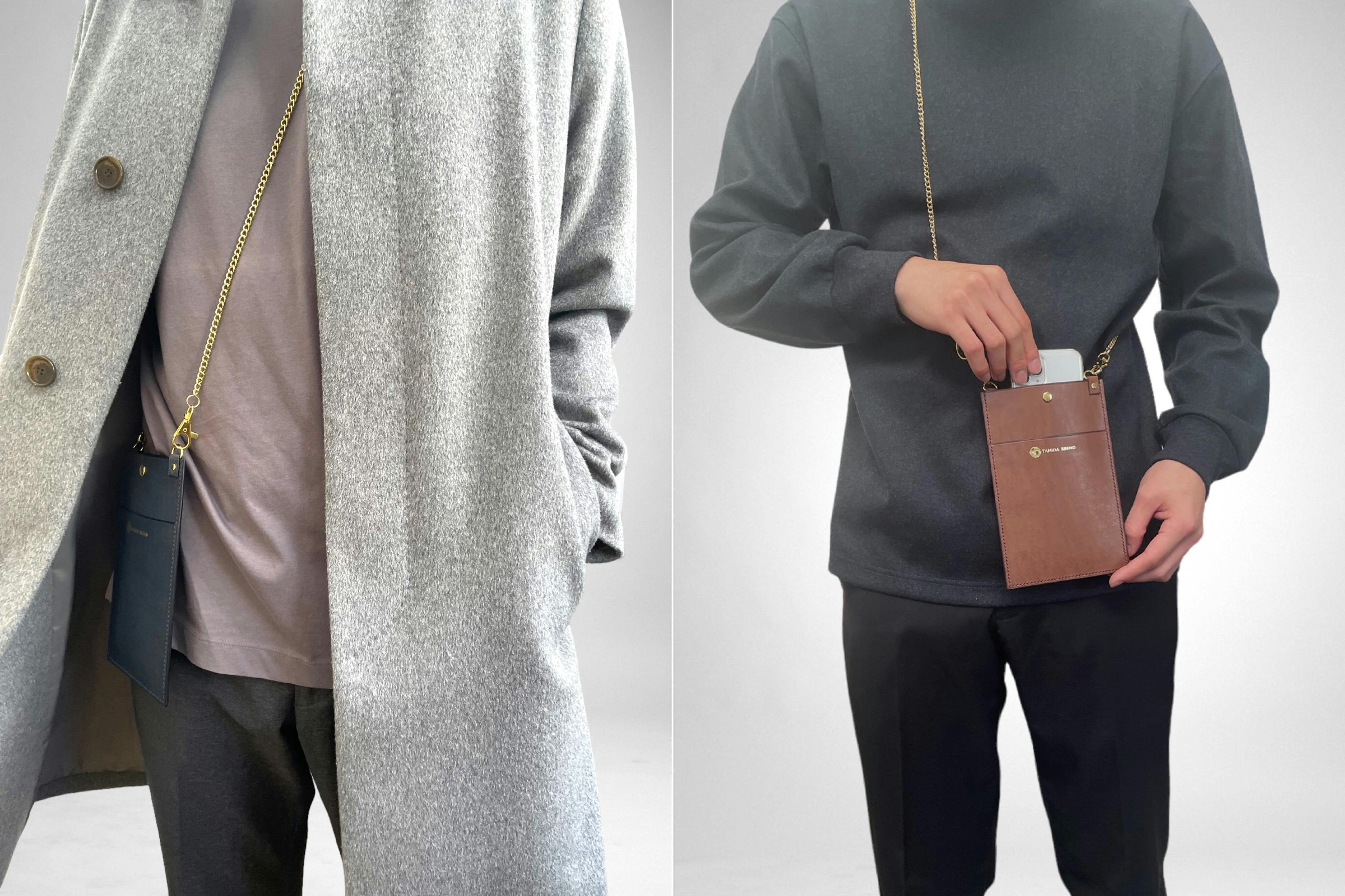 コートやダウンの邪魔にならない薄さに設計しているので着崩れをしないデザインとなっています。また、ショルダー部分を高級感あるチェーンを使用する事によりただの機能的なスマホショルダーではなく、余裕のある大人へと演出するアイテムとなります。