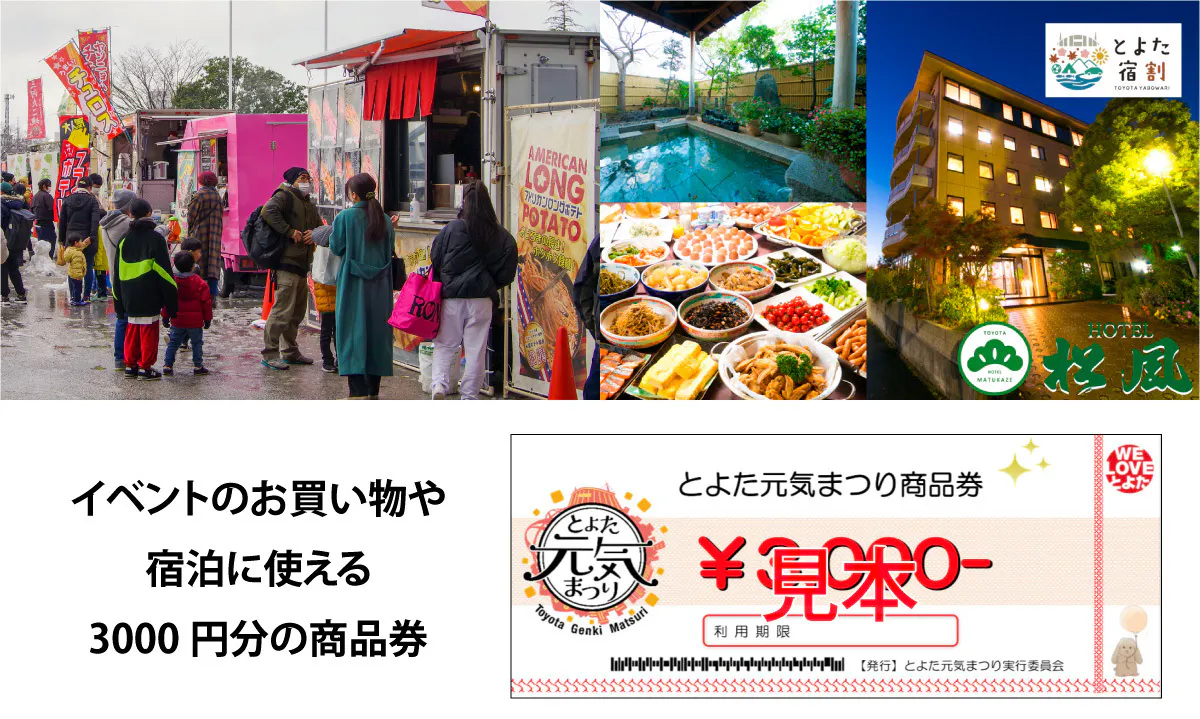 宿泊では豊田市の旅行支援とよた宿割との併用で割引があったり、地域クーポン券がついたり、お得に宿泊も可能です。ぜひご活用ください。もちろん当日イベントでの商品券としてもご活用いただけます。