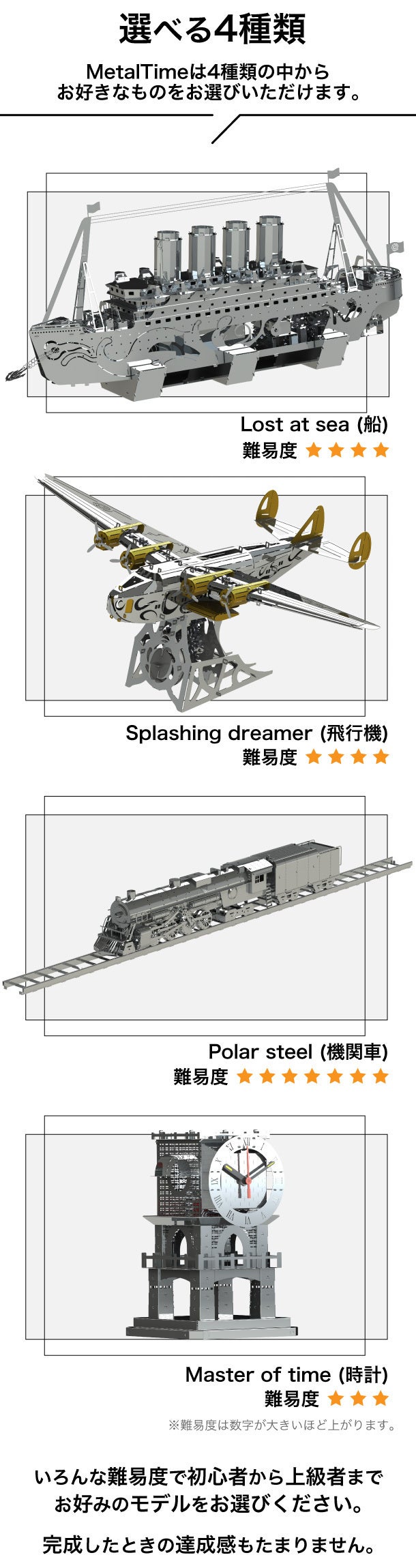 難易度に合わせて、メタルモデルの初心者から上級者まで。