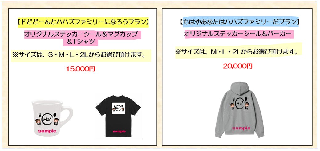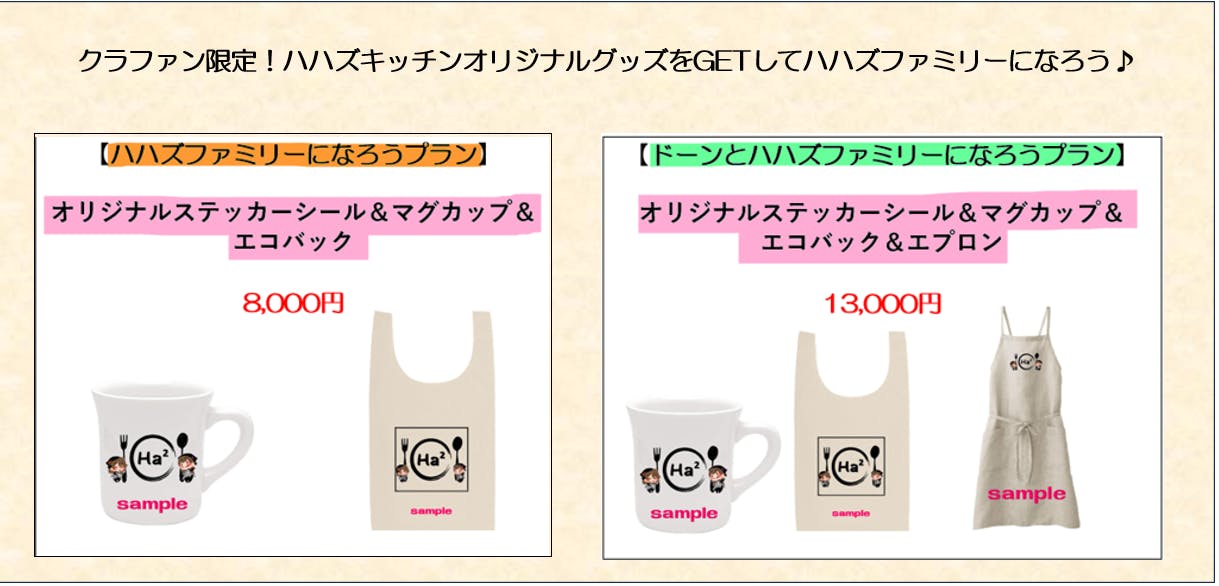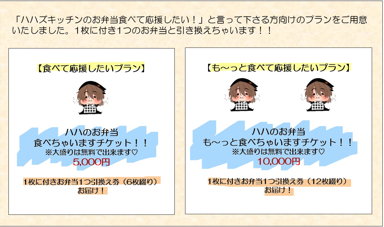 リターンには、とにかく応援したい!方向けの少額のプランから、かわいい「ハハとむすめちゃん」のグッズ、お弁当の引き換えチケットやお料理教室まで、バラエティ豊かに私たちができる【ありがとうの気持ち】をご用意しました。