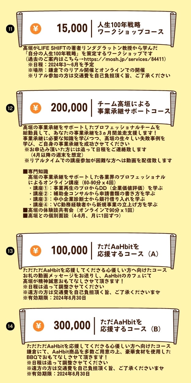 13種類の異なるリターンをご用意させて頂きました。アービットで人気のケーキ詰め合わせから、5種のケーキ食べ比べセット、マンスリーケーキ定期便など、お気に入りのセットをお選びください。また、高垣が不定期で開催していて、160名が受講待ちしている「人生100年戦略ワークショップ」の受講や、最近お問い合わせが増えてきた「事業承継のサポート」もリターンに加えさせて頂きました。ご興味のある方はぜひご検討くださいませ。