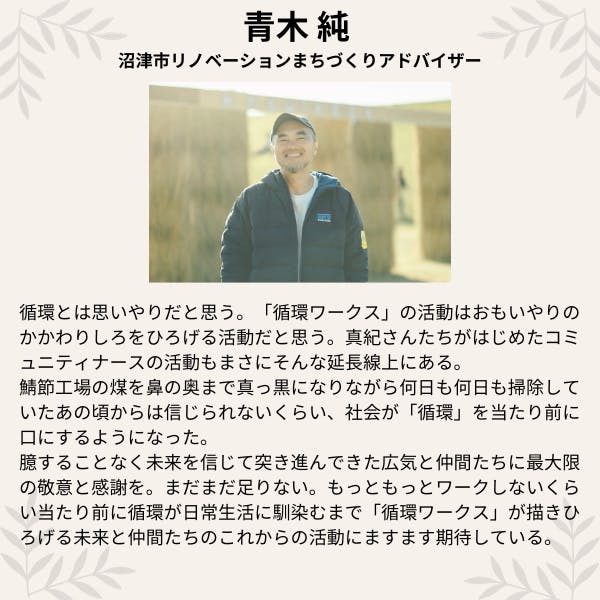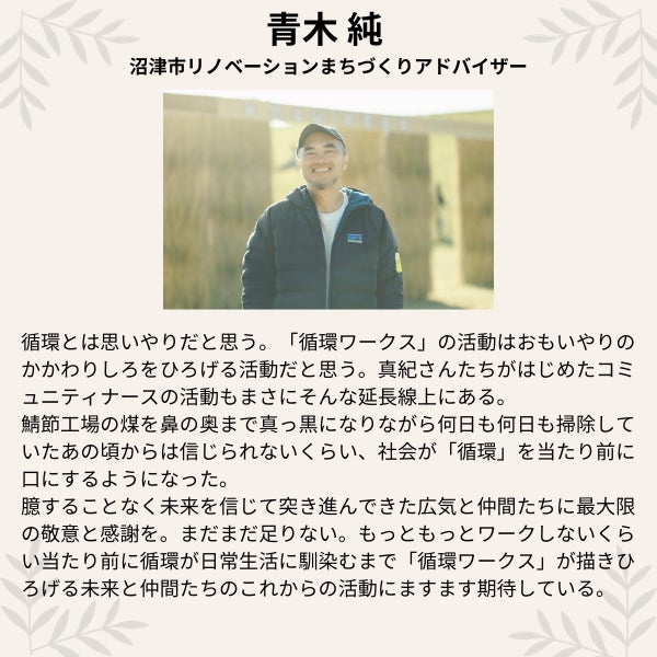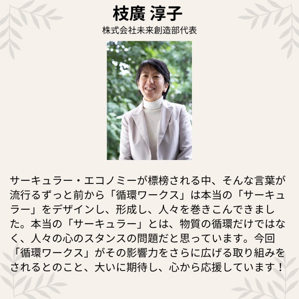 多少、人間が不便になっても、環境に負荷を与えないことを優先していく。それは、難しいことではなく、大変なことでもなく、ほんの少しでも、誰もが、地球環境のためにできることがある、ということを広めたいと思って『循環ワークス』を運営しています」