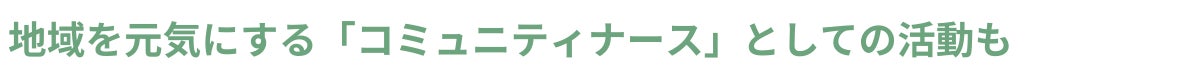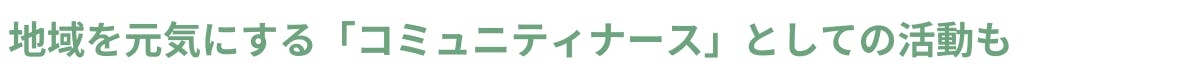 「思いやりの循環」の一環として、住宅地の真ん中でヒトとコトをつなぎ、まちを元気にするコミュニティナースの活動もはじめました。地域の人の暮らしの身近な存在として『毎日の嬉しいや楽しい』を一緒につくり、『心と身体の健康と安心』の場を提供しています。