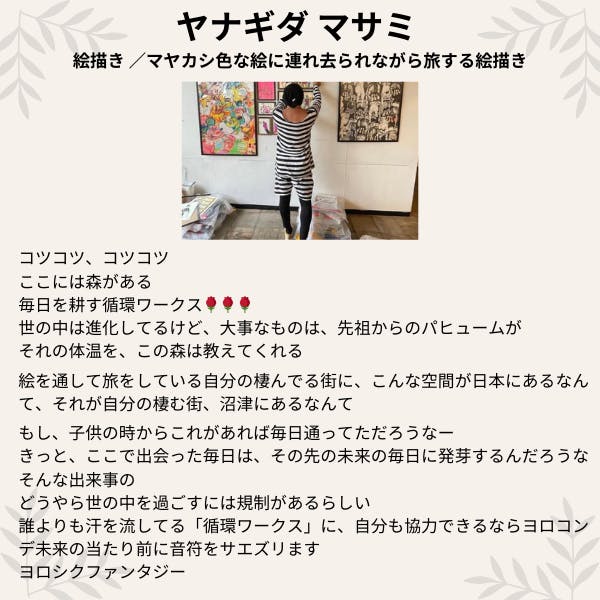 「循環ワークス」の営業部長!地方再生や、空間デザイン、インテリアを学び、生まれ育った沼津市のまちづくりに日々、奔走。自治体や地域の人に、循環ワークスの活動を広めてくれている頼もしい存在。空きビルを活用したギャラリーspace'戯曲'主宰。