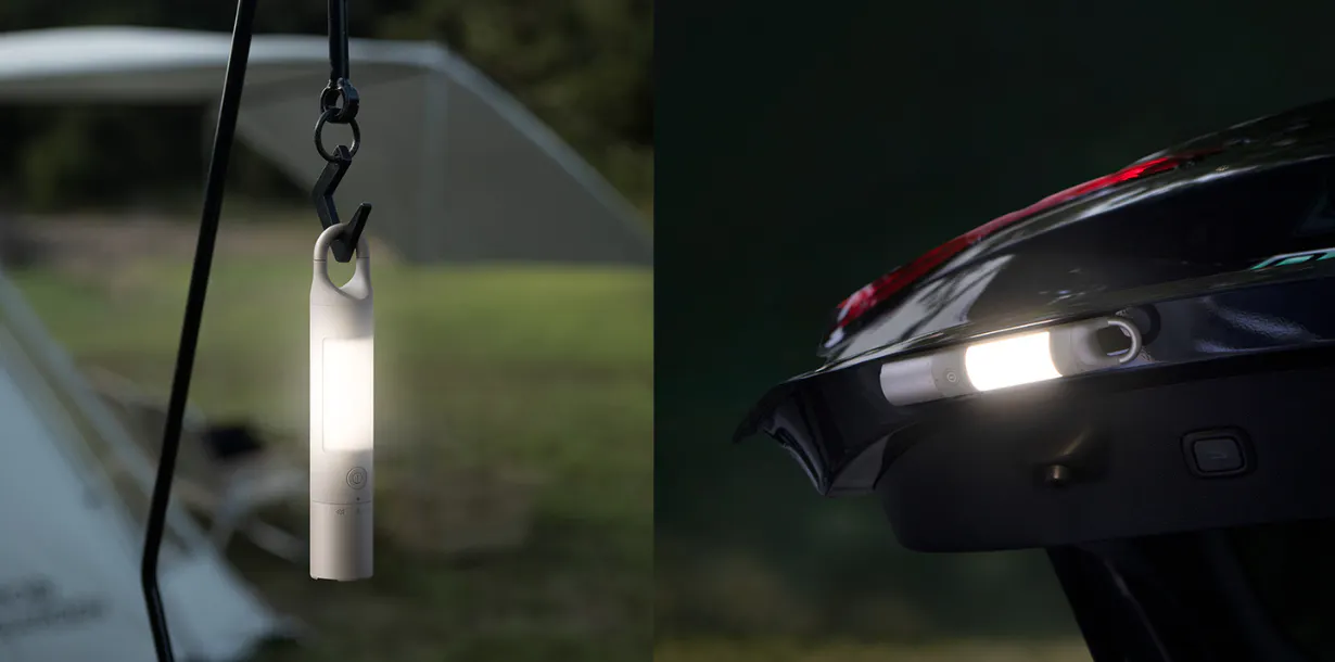 「DUO」には遠くを照らす懐中電灯になる「メインライト」、暗い場所でも手元を照らしたり雰囲気づくりも役立つ「サイドライト」を搭載。