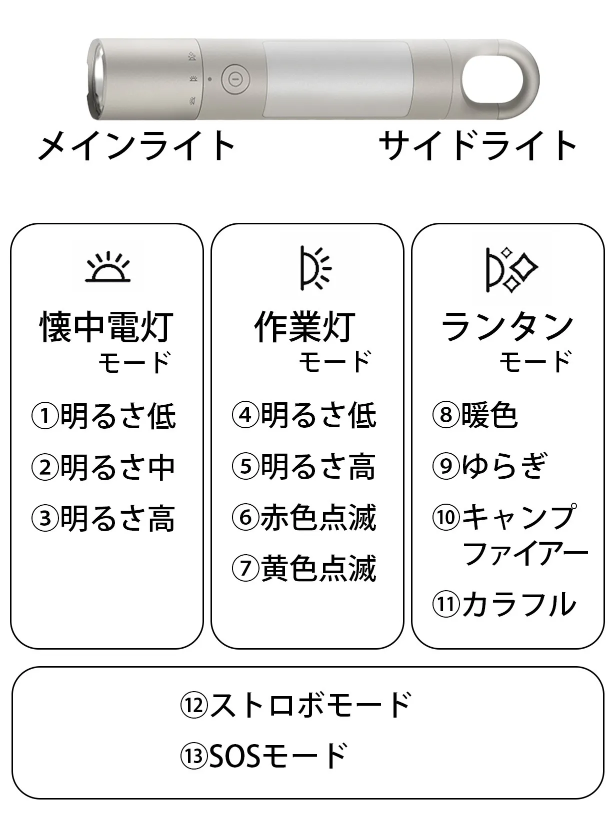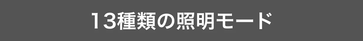 懐中電灯モード3種+作業灯モード4種+ムードランタンモード4種+ストロボモード+SOSモード=13種類もの照明モードがあります。