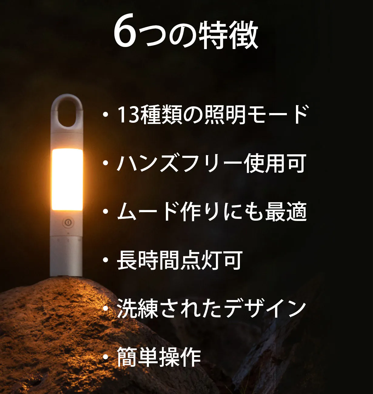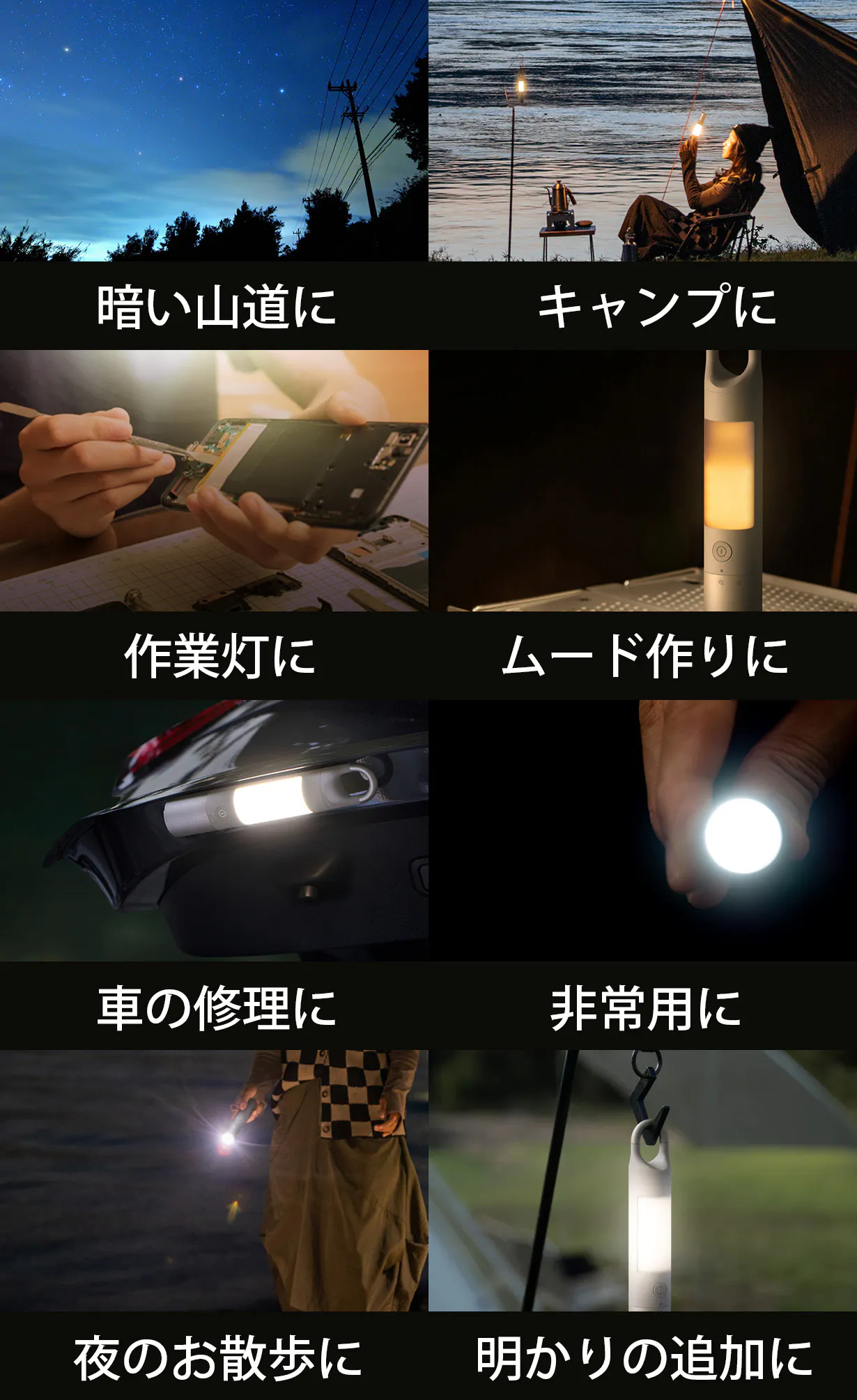 アウトドア時の暗い山道から自宅の寝室まで。日常の癒しの時間から災害などの非常時まで。手に持って歩きながら照らしたい時からDIYなど手を空けて作業したい時まで。