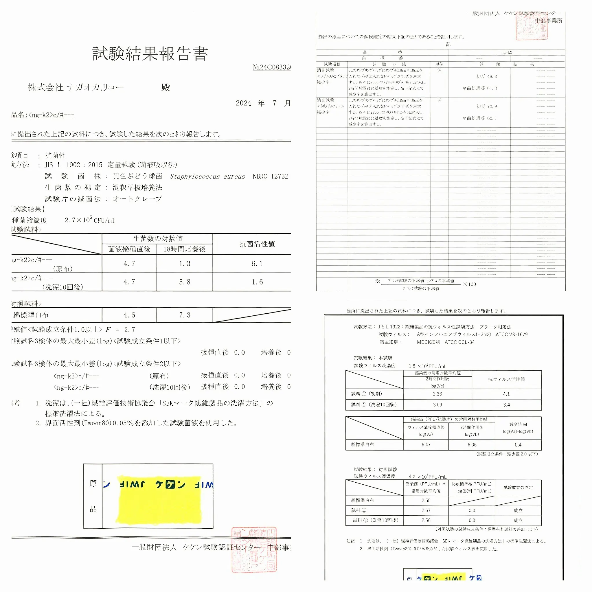 また、本商品で使われている銅繊維は、ニオイ成分で代表的なイソ吉草酸・アンモニアでの脱臭効果試験で実証済みです。