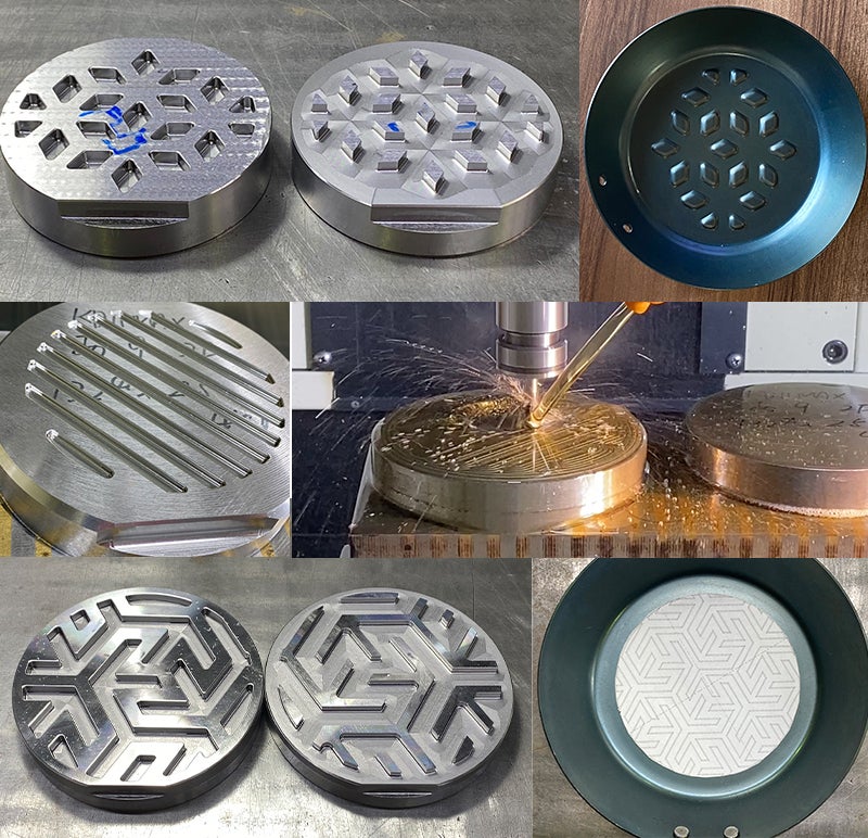 他社ではほとんど使われていない「へら絞り加工」で製造。鉄板を高速で回転させ、そこにローラーを押し付けて成形を行います。