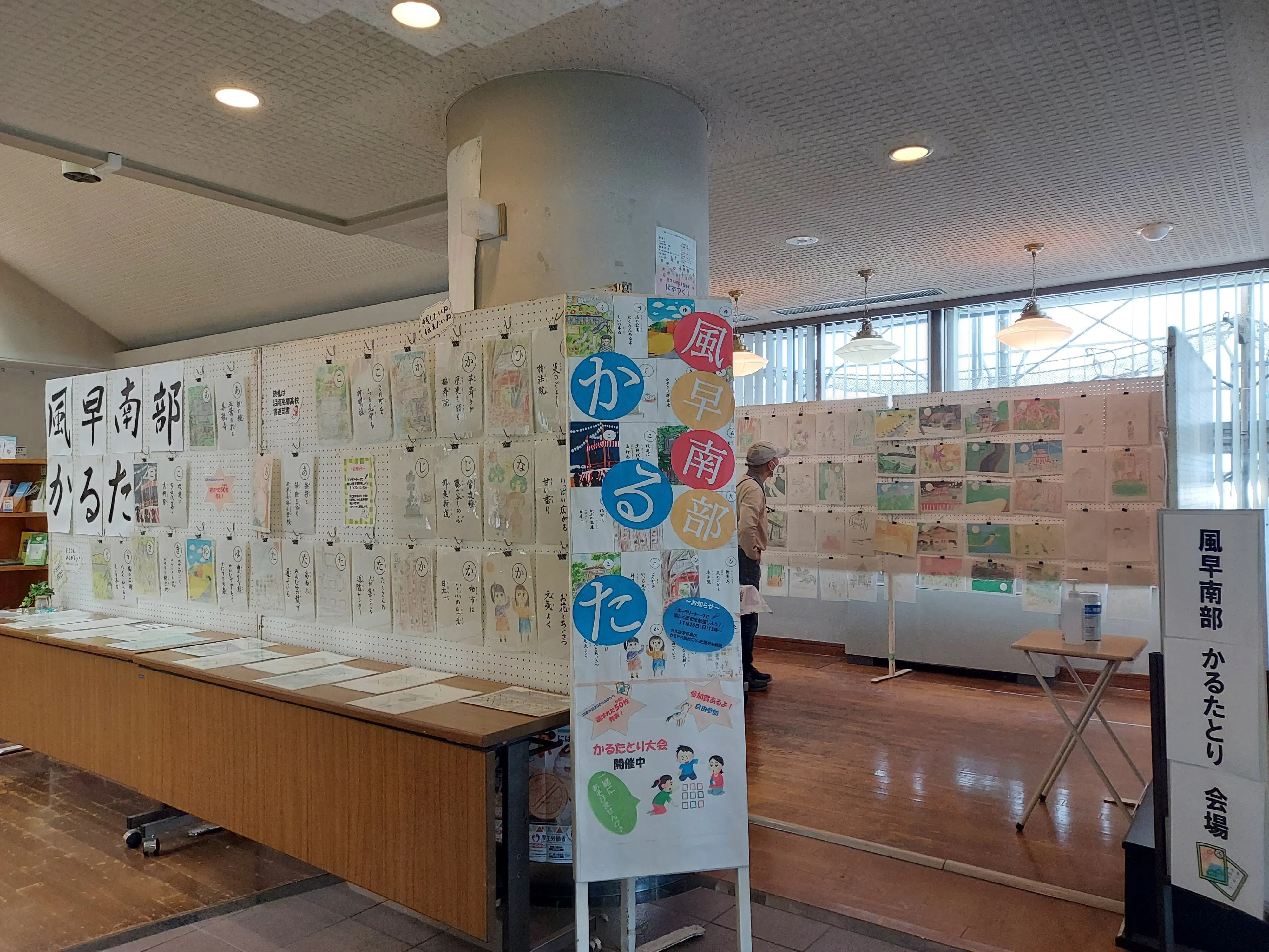 たくさんの生徒さんが応募してくださった高柳小学校の廊下「ゆめのかけはし」には、A4版の絵札と読み札が展示されています。