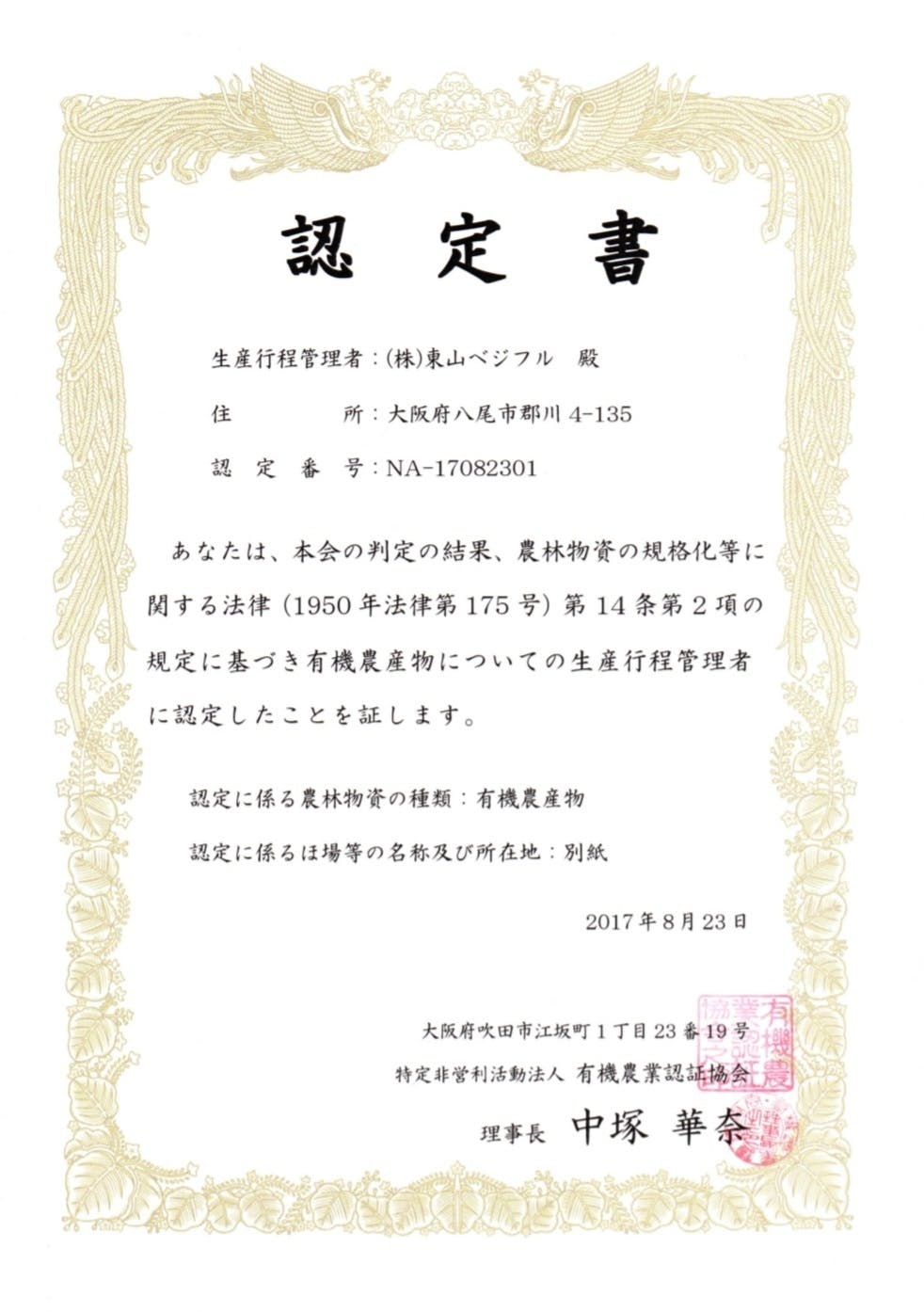 大阪府八尾市と鹿児島県鹿屋市の自社農場は、有機JAS認証を取得しています。
