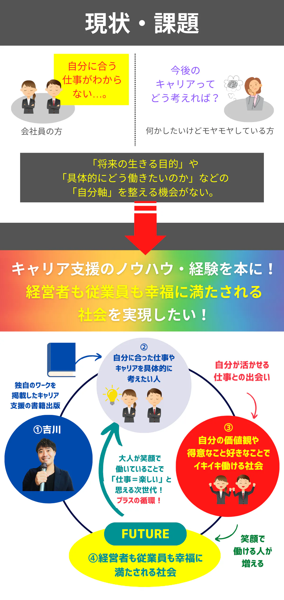 書籍には、私がこれまでのキャリア支援で得たノウハウや経験のエッセンスを掲載します。また、「将来の生きる目的」や「普段の行動にどう落とし込んでいけば良いのか」などの「自分軸」を整理できる【独自のワーク】も掲載いたします。キャリアで悩まれている方々の今後の進む方向性を発見していただくための内容を執筆いたします。