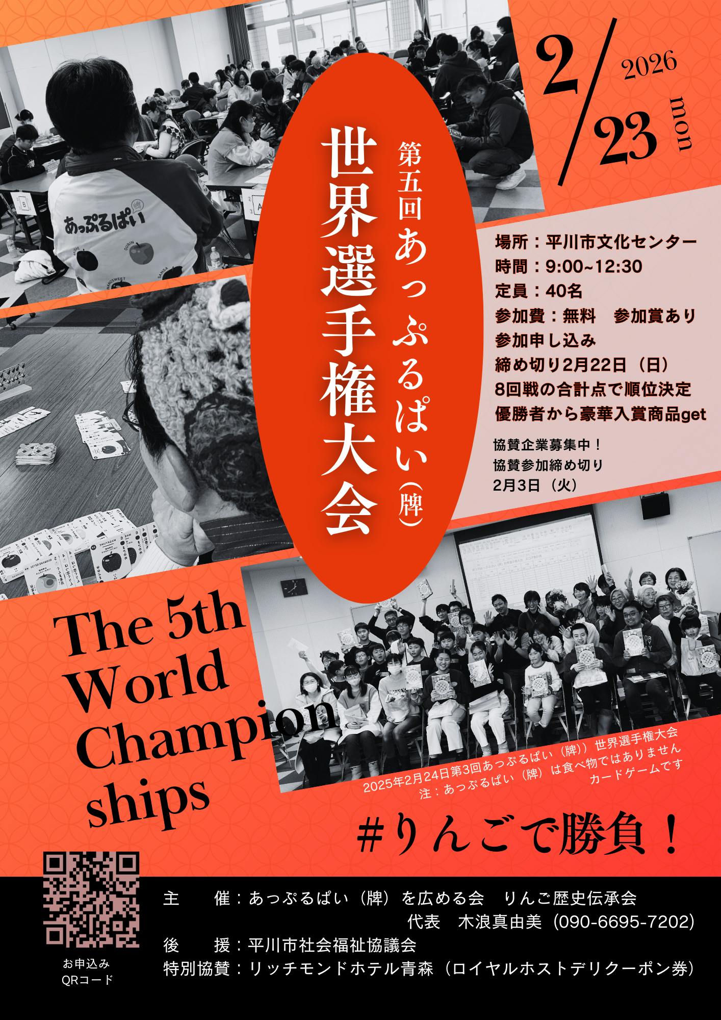 2025/12/24 12:05あっぷるぱい(牌)を愛する皆さまへメリークリスマス!年末年始のお忙しい中失礼いたします。来る、2026年2月23日(月・天皇誕生日)、第5回あっぷるぱい(牌)世界選手権大会が開催されます。皆さま奮ってご参加ください。今回は後援に平川市社会福祉協議会さまが特別協賛にリッチモンドホテル青森さまが、協力頂ける事となりました。ロイヤルホストデリクーポン5,000円2セット、あっぷるぱい(牌)3セット他点数上位者からお好きな景品を選んでいただけます。ぜひ、ご家族皆さんで参加してください。また世界選手権大会と銘打っていますので、世界中の方にご参加頂きたいです。お誘いあわせの上参加してください。お申込みはこちらhttps://forms.gle/5LbP7rvyFbT3pXj2A宜しくお願いいたします。あっぷるぱい(牌)を広める会木浪真由美 (090-6695-7202) もっと見る