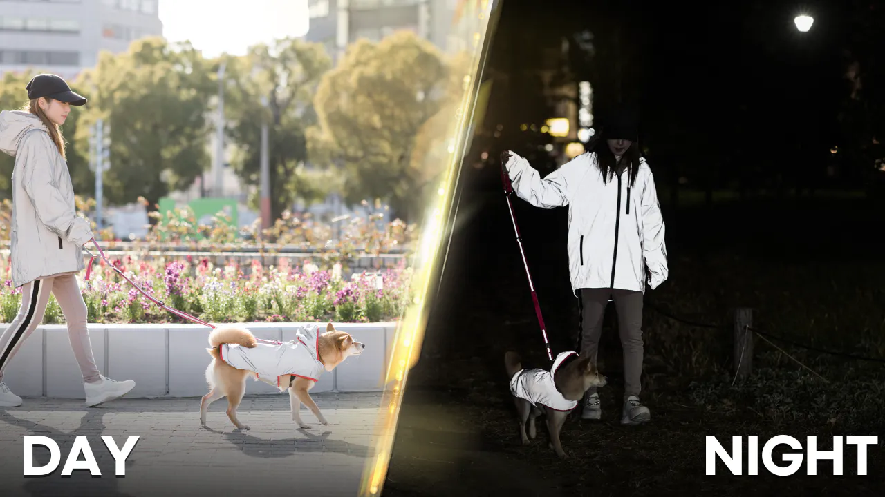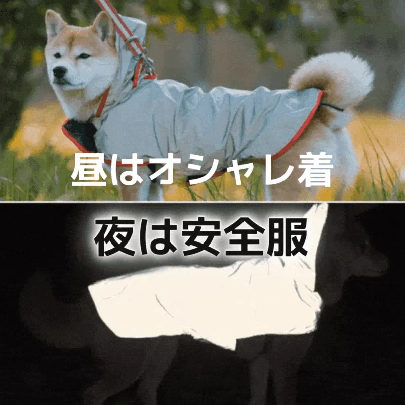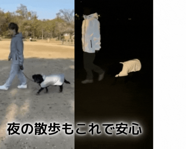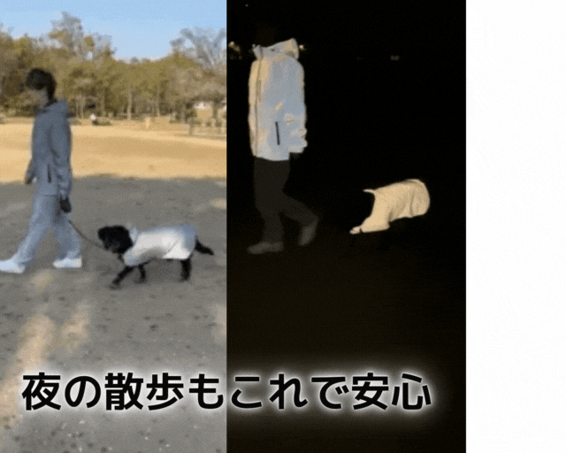 暗闇で光に反射して真っ白に光り、愛犬の存在を知らせてくれる 「魔法の犬用ジャケット」