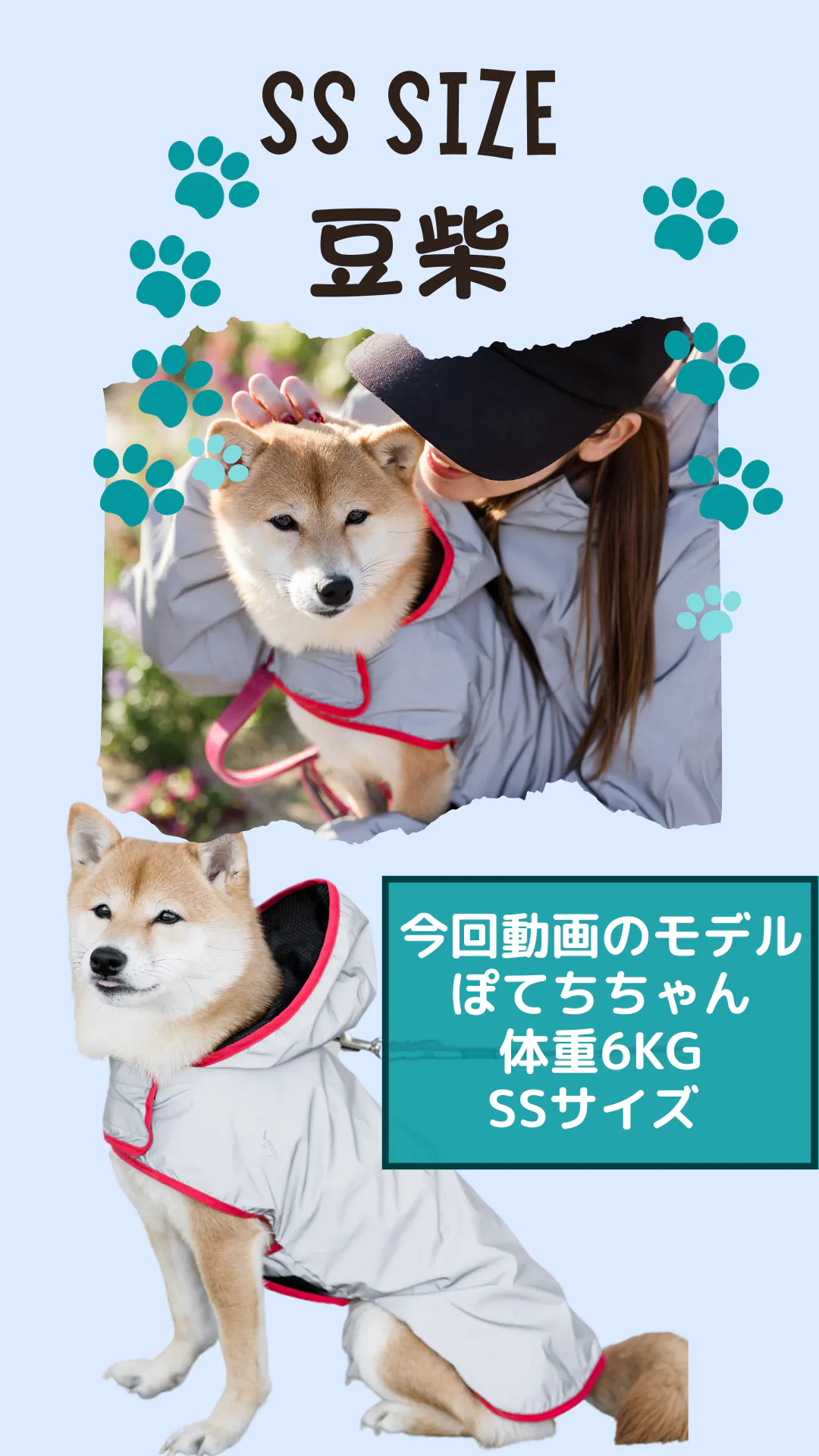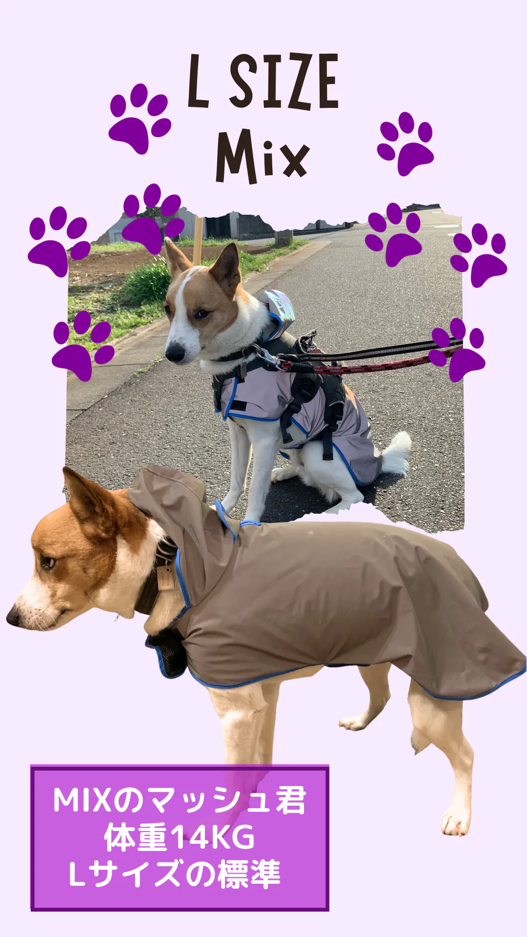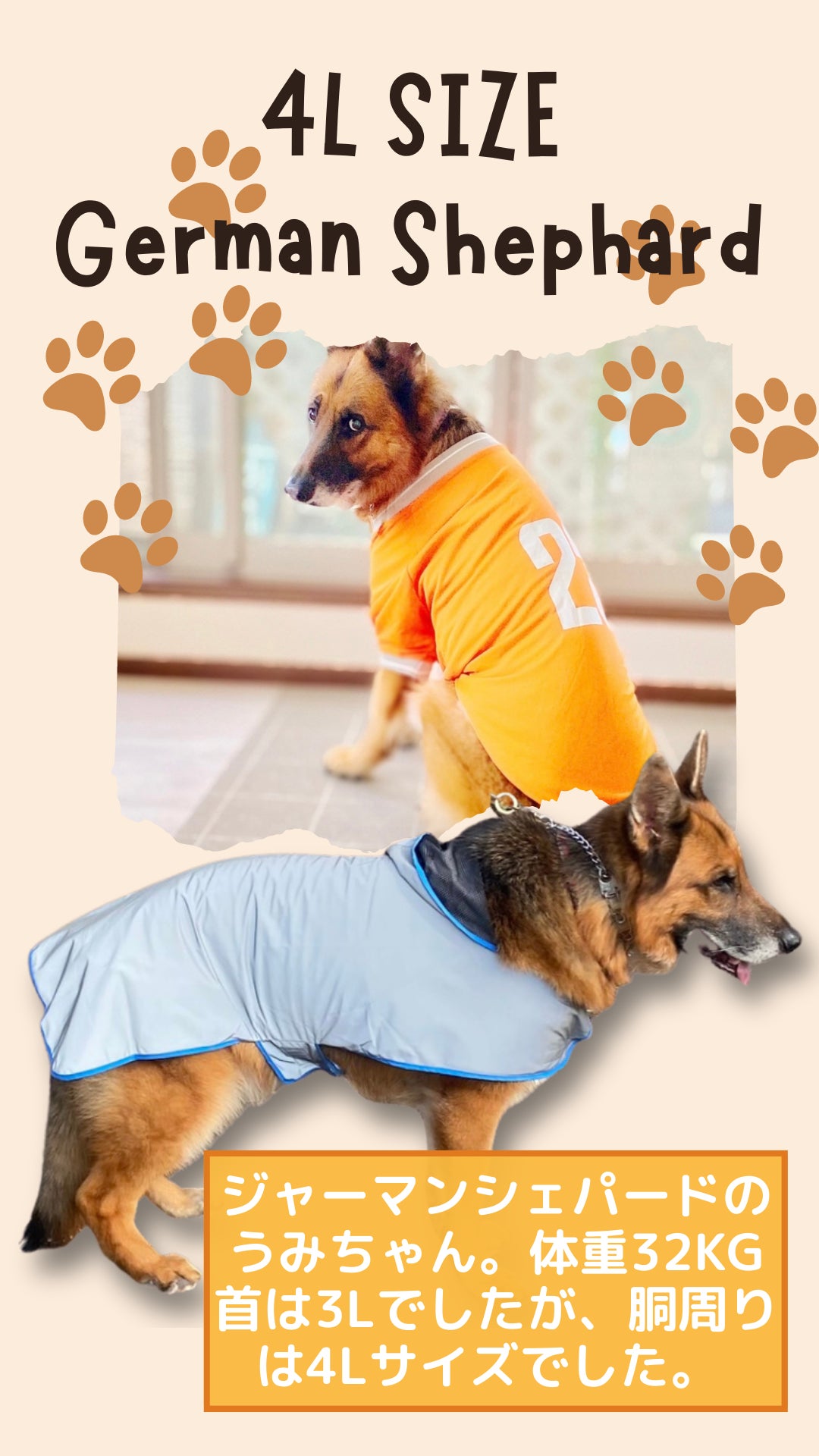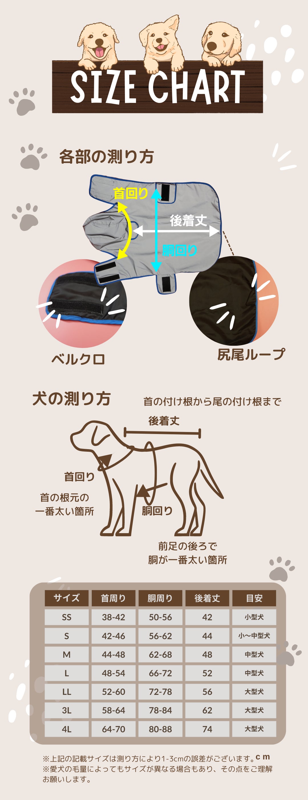 A:ワンちゃん計測は難しく、体型・種別・毛量によっても差が生じます。ピカジャケ for dogsは突然の雨にも対応できるよう長めの作りです。首周り、胴回りを優先したサイズをご選択ください。