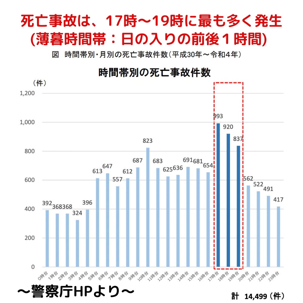 交通事故は日が暮れ始める17時から19時台の薄暮時間帯に多発しています。