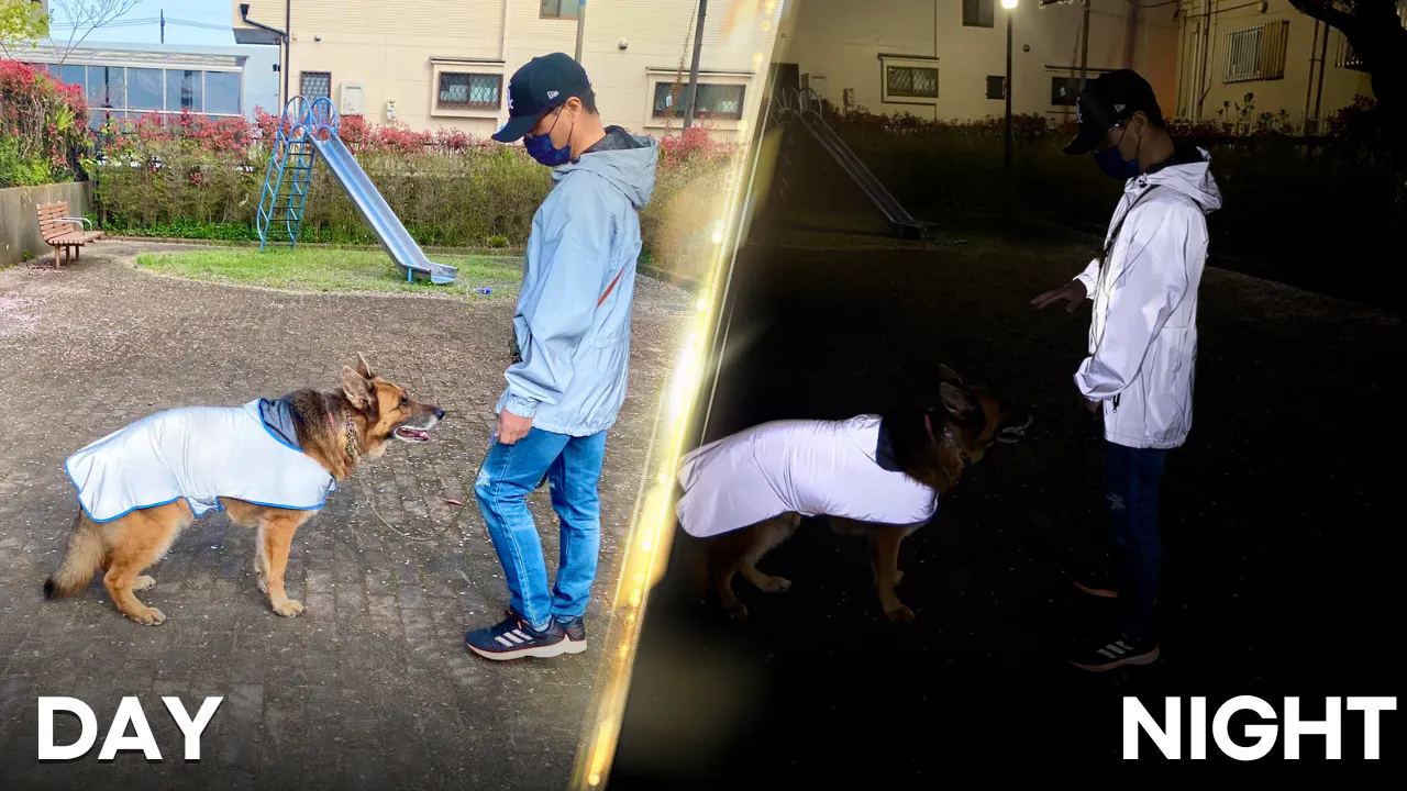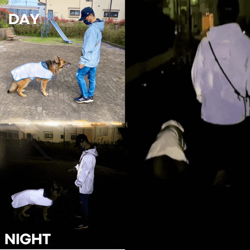 ピカジャケ for dogsはこんなに光るので視認性バツグンです。