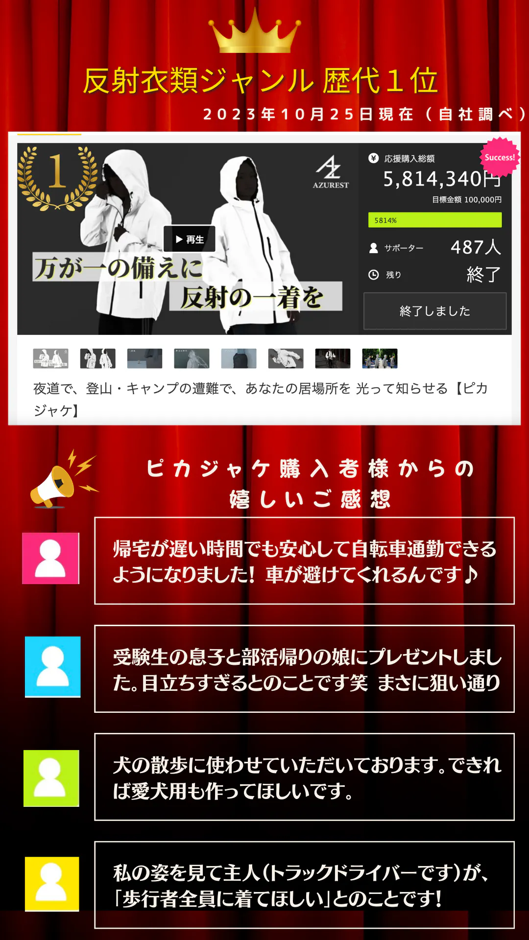 今後も引き続き、「もしもの備え、ピカジャケアイテム」をお届けできるように、支援いただいた資金は、社会から悲しい事故を減らす、皆様を守る、ピカジャケアイテム開発費用として使用いたします。